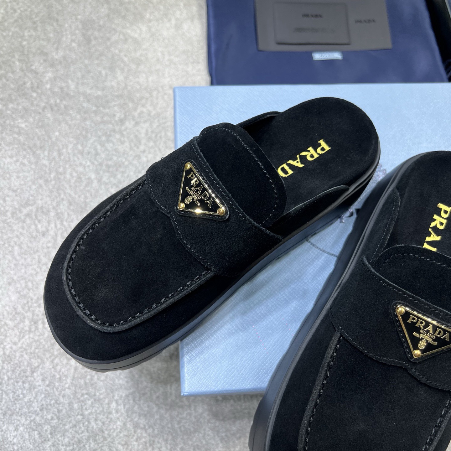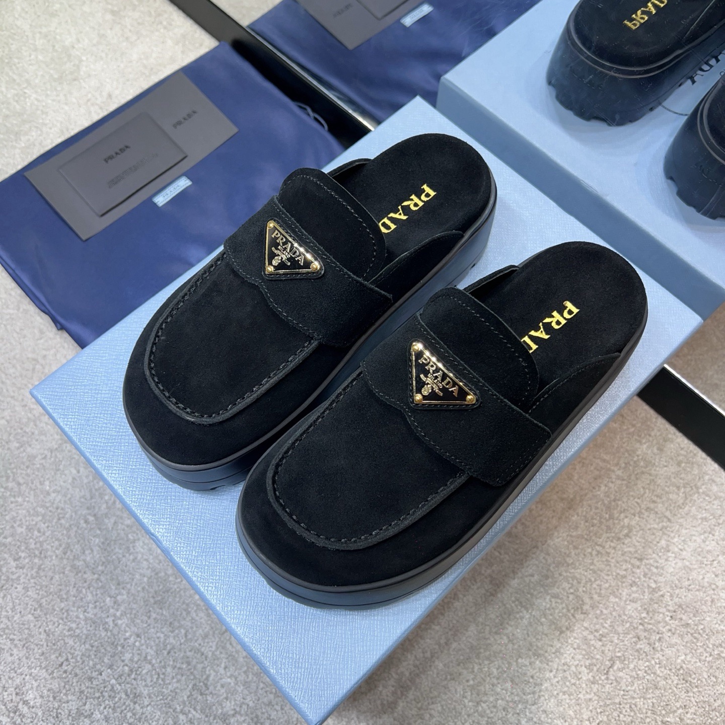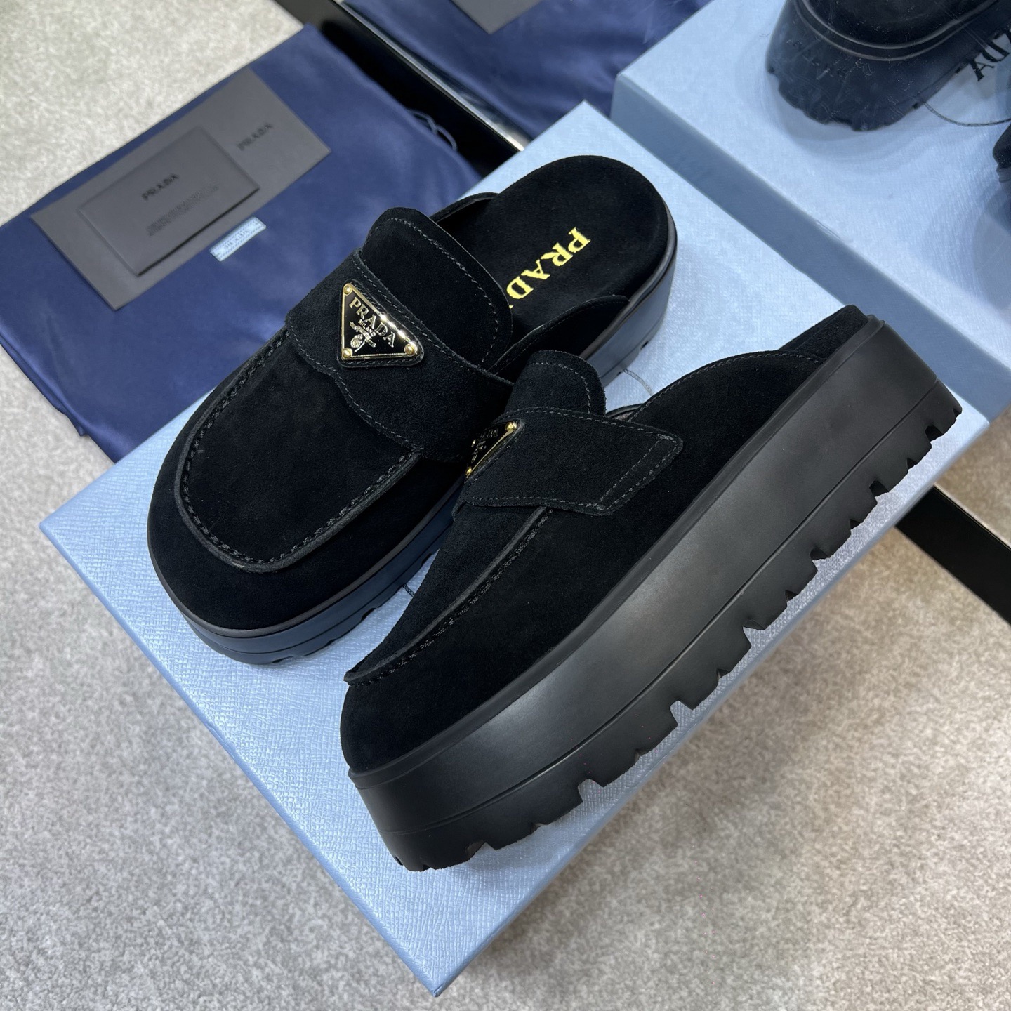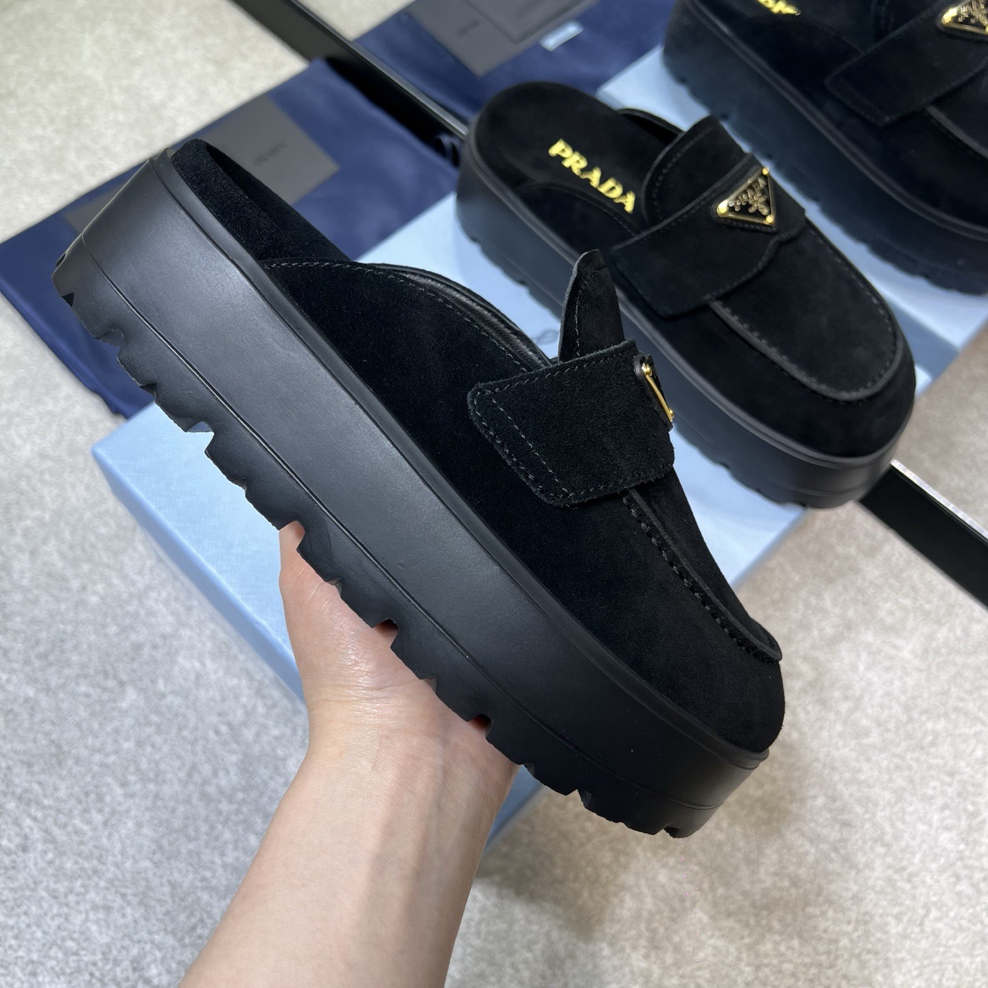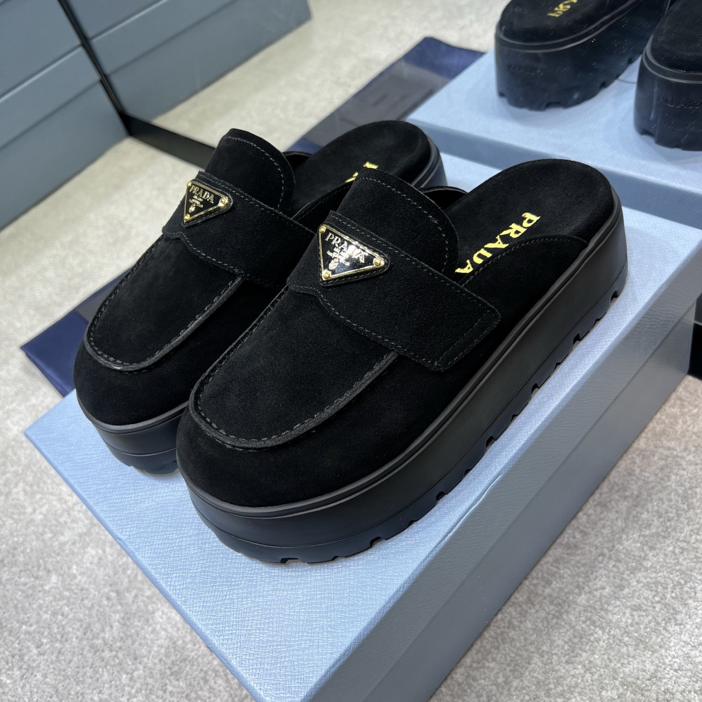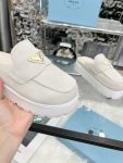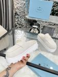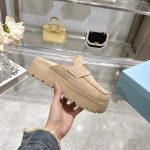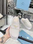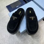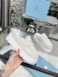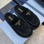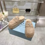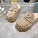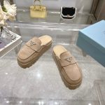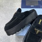 The iconic geometric shape of the Pr triangle brings inspiration to heel design, highlighting cone and soft curves with a unique modern touch. High gloss suede lining with sheepskin in 3 colors, available in sizes 35-41 p795748