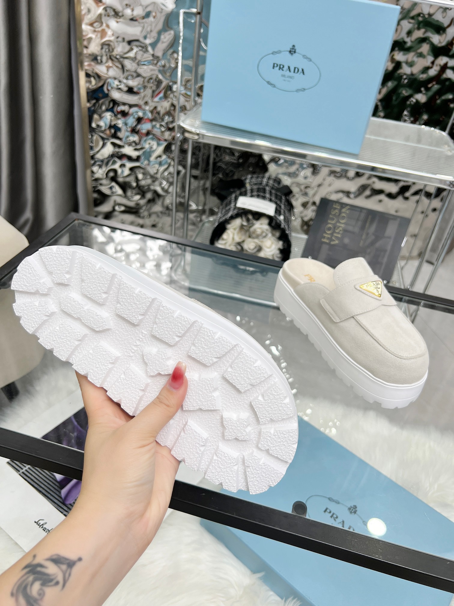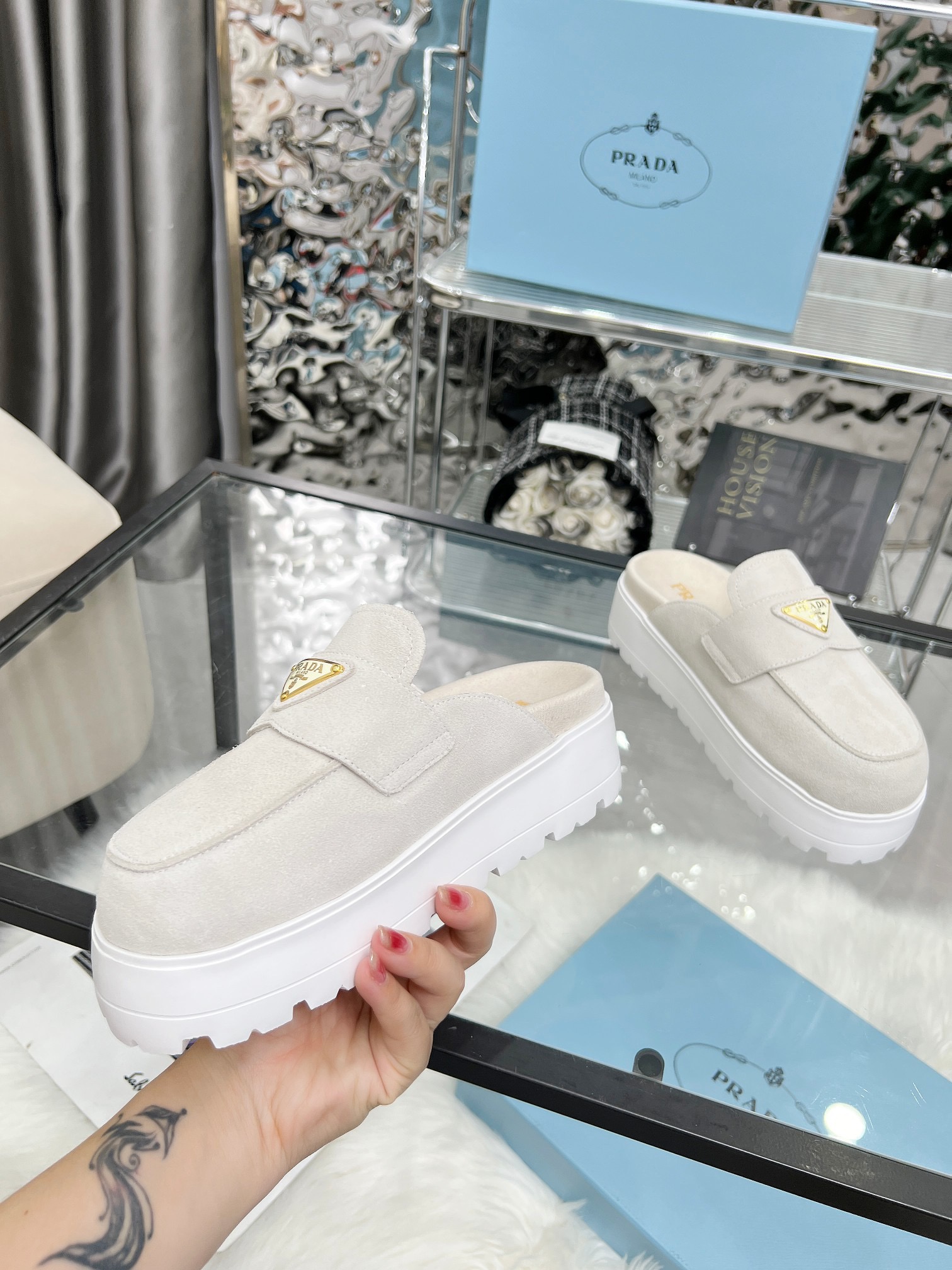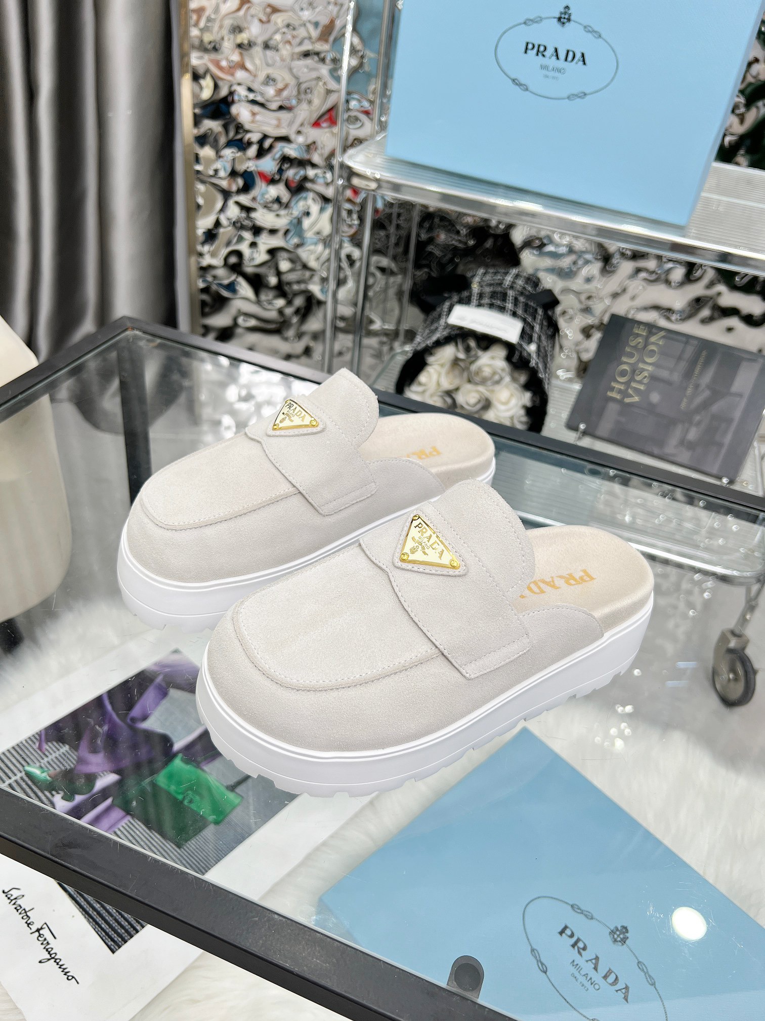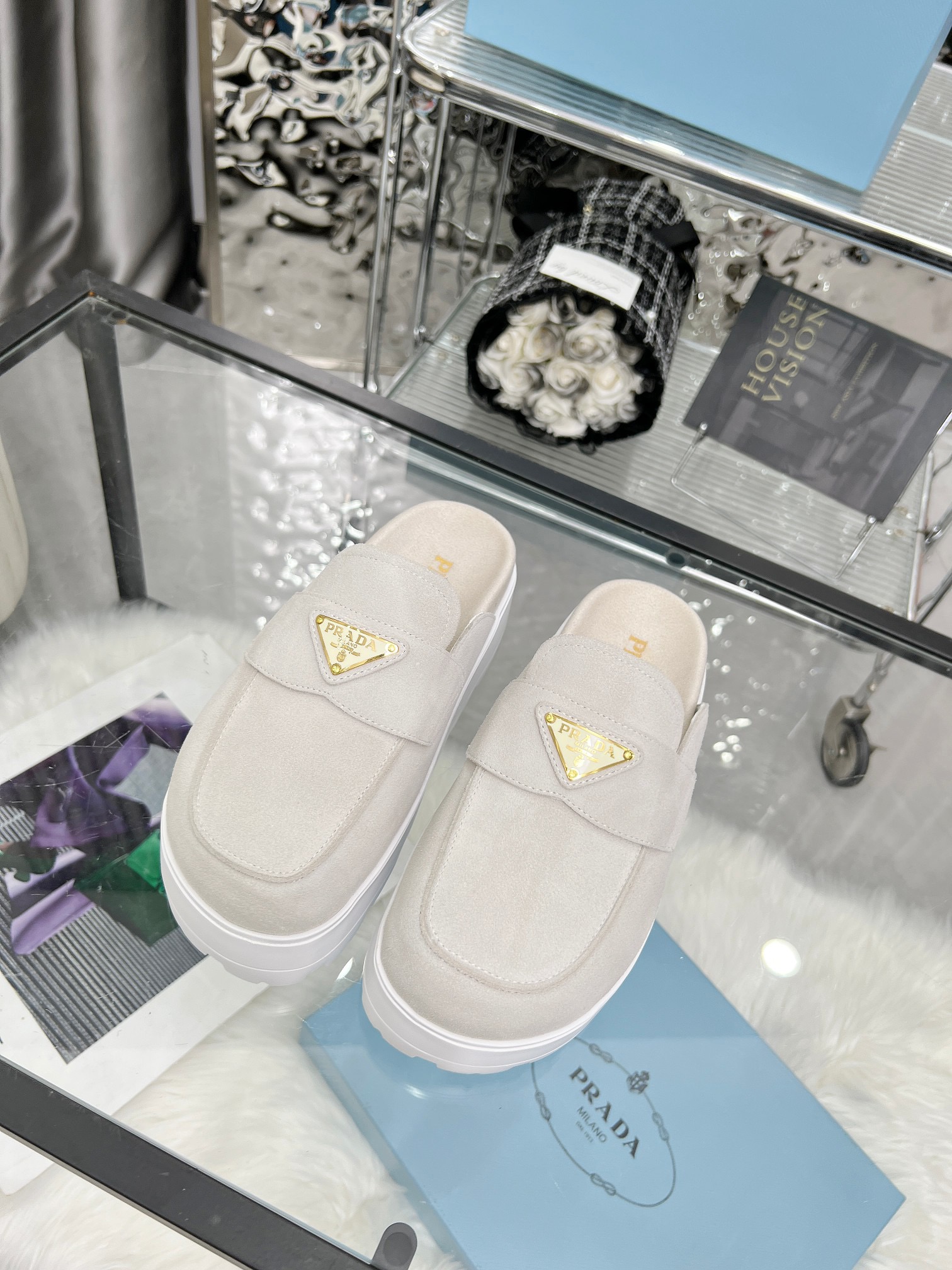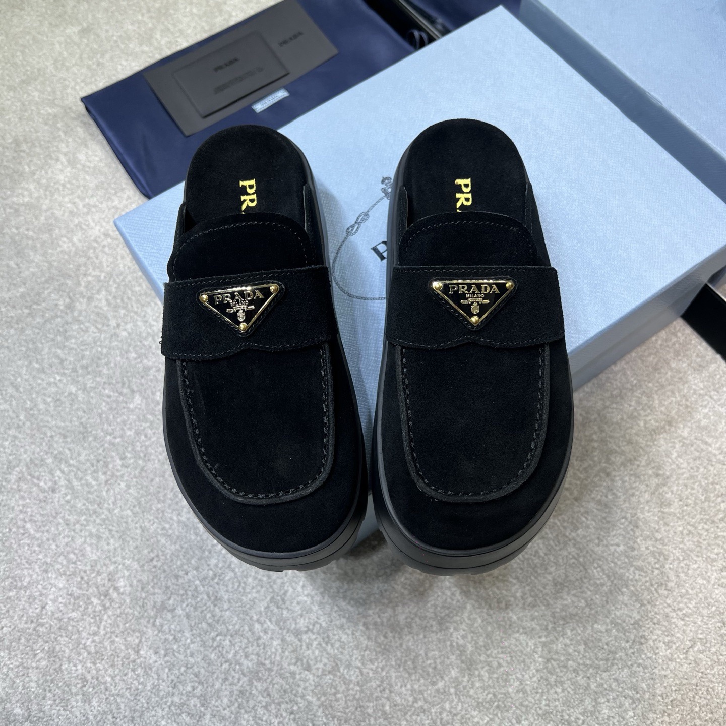 The iconic geometric shape of the Pr triangle brings inspiration to heel design, highlighting cone and soft curves with a unique modern touch. High gloss suede lining with sheepskin in 3 colors, available in sizes 35-41 p795748