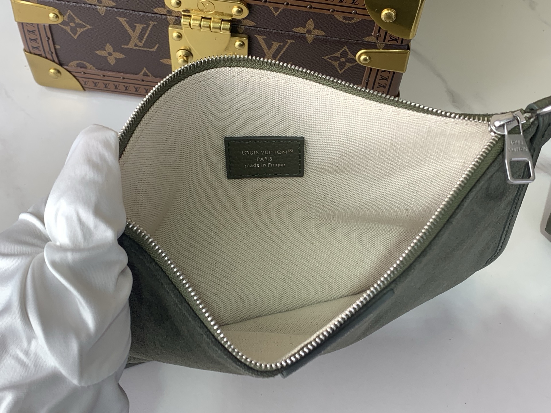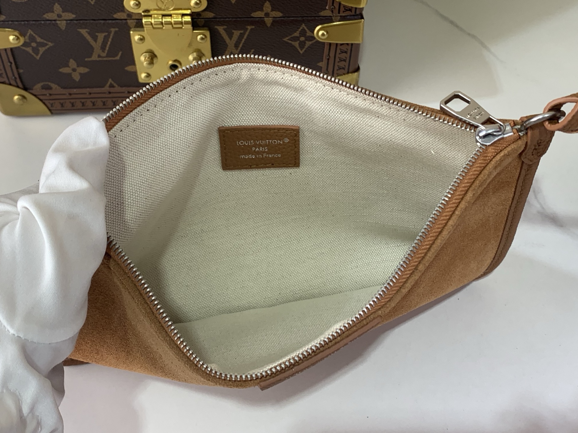 Crafted from smooth grain leather combined with tonal suede detailing, it offers a sophisticated dual-texture look. The front and back pockets include signature V-shaped stitching, while the spacious interior provides functional organization. A detachable suede pouch adds convenience for small essentials, and the adjustable strap allows comfortable shoulder carry.