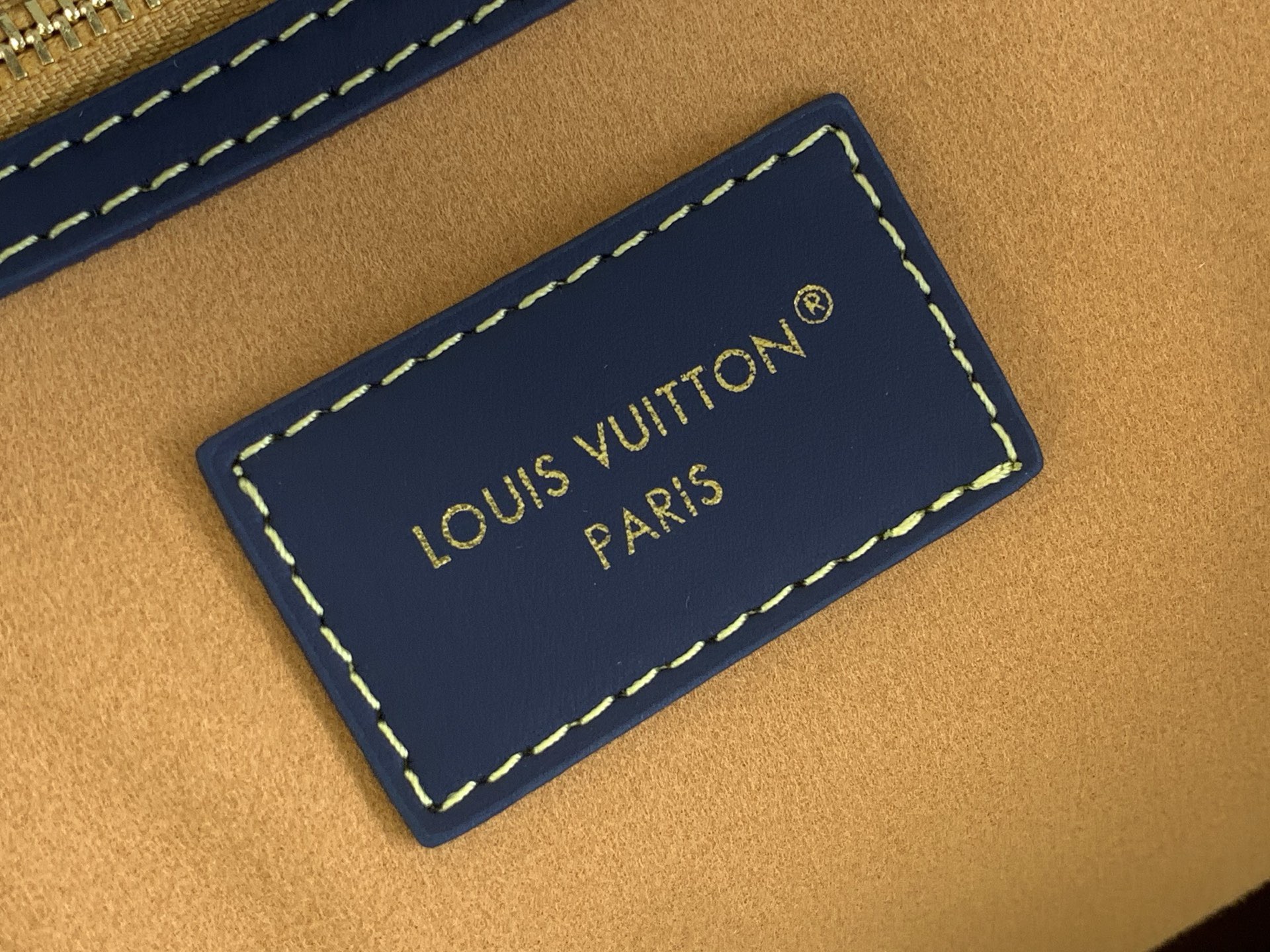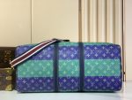 This Keepall Bandouli è re 50 travel bag features Monogram coated canvas painted with rugby shirt style stripes, cleverly accentuating the Marque L. Vuitton D é pos é e logo and showcasing Pharrell Williams’ cutting-edge reshaping of classic materials. The cow leather top handle and reinforced side straps are integrated, and the detachable striped shoulder strap adds dynamic vitality.