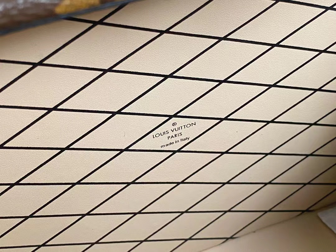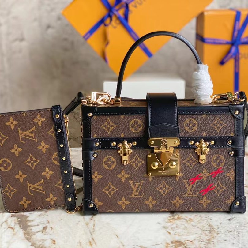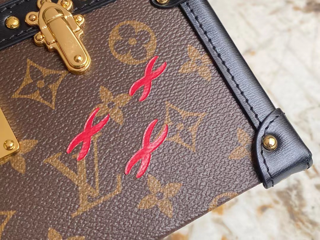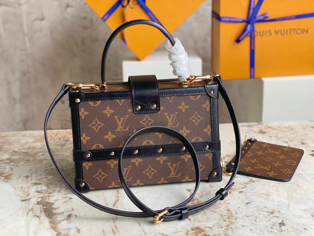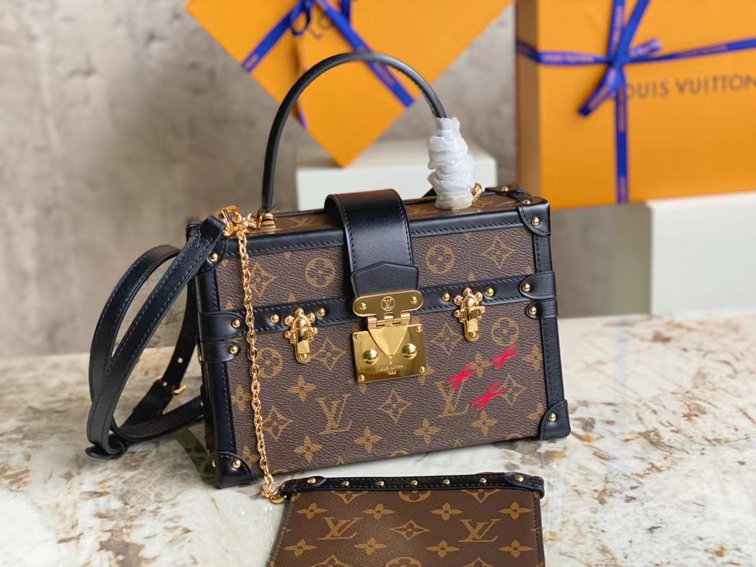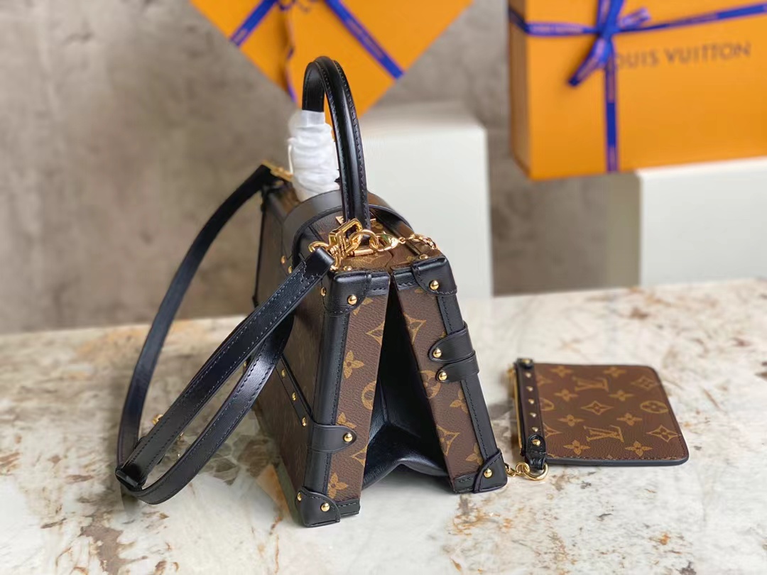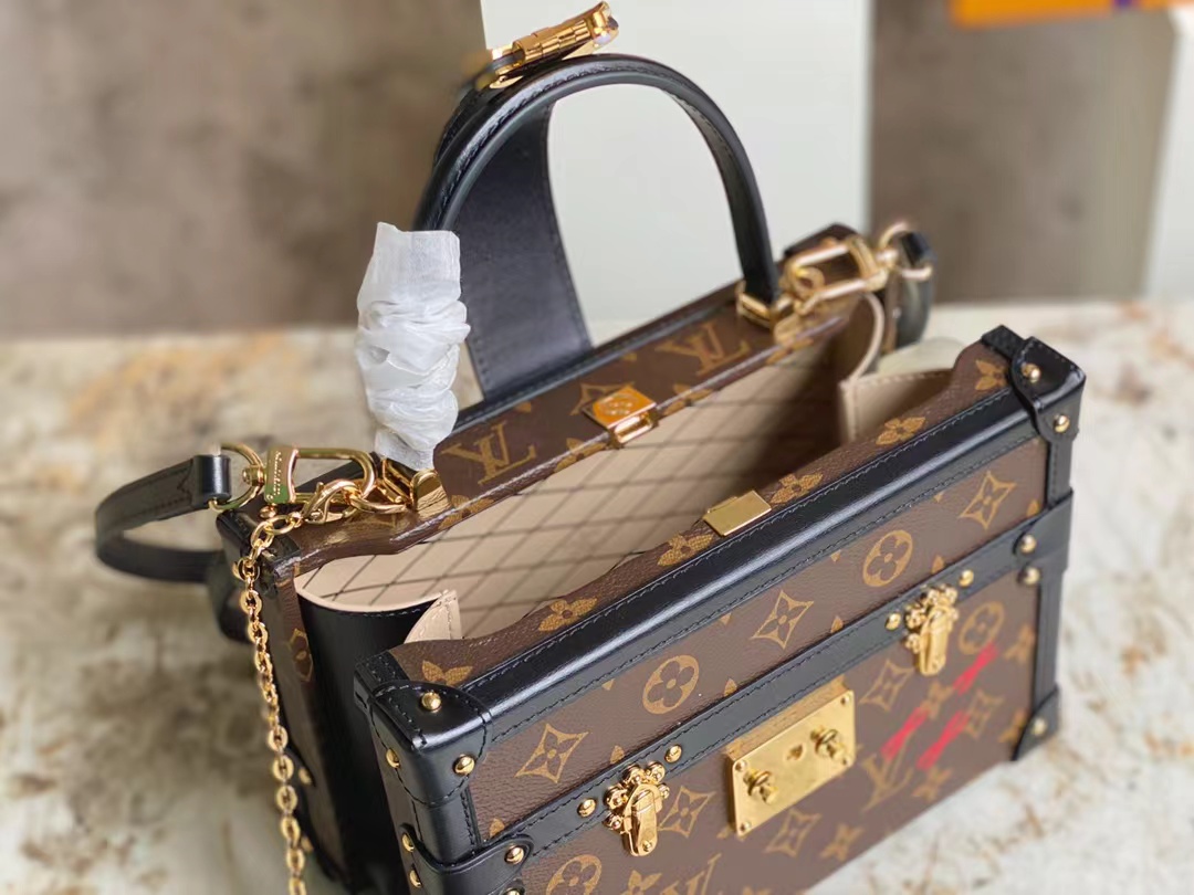 Nicolas Ghesqui è res, the top original M46309 box and case series, once again retraced the tradition of box making to create this Petite Malle V handbag. Monogram canvas with leather trim, the side lining presents a V shape, creating a soft texture and ample space. The included Monogram zip inner pocket is secured with a chain. Dimensions: 24 x 16 x 13 cm.