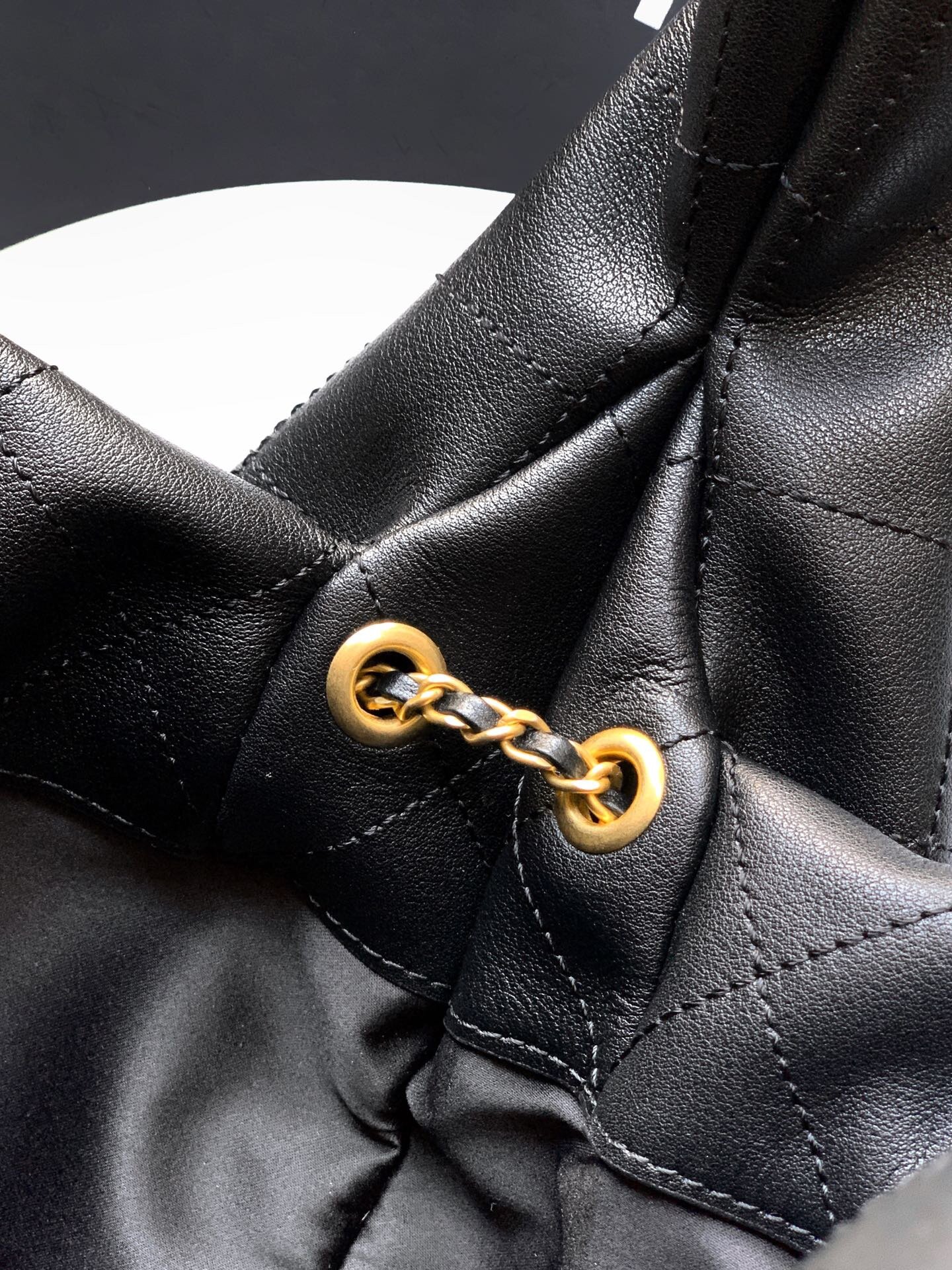 A signature design element is the dual-chain drawstring detail. The metal chain and leather combination creates a refined contrast, blending strength with softness. This feature not only adds visual interest but also enhances functionality, allowing the bag opening to be gently adjusted while maintaining secure closure. The chain shoulder detail provides a comfortable carry experience, distributing weight evenly and adding a subtle metallic accent that elevates the overall look.