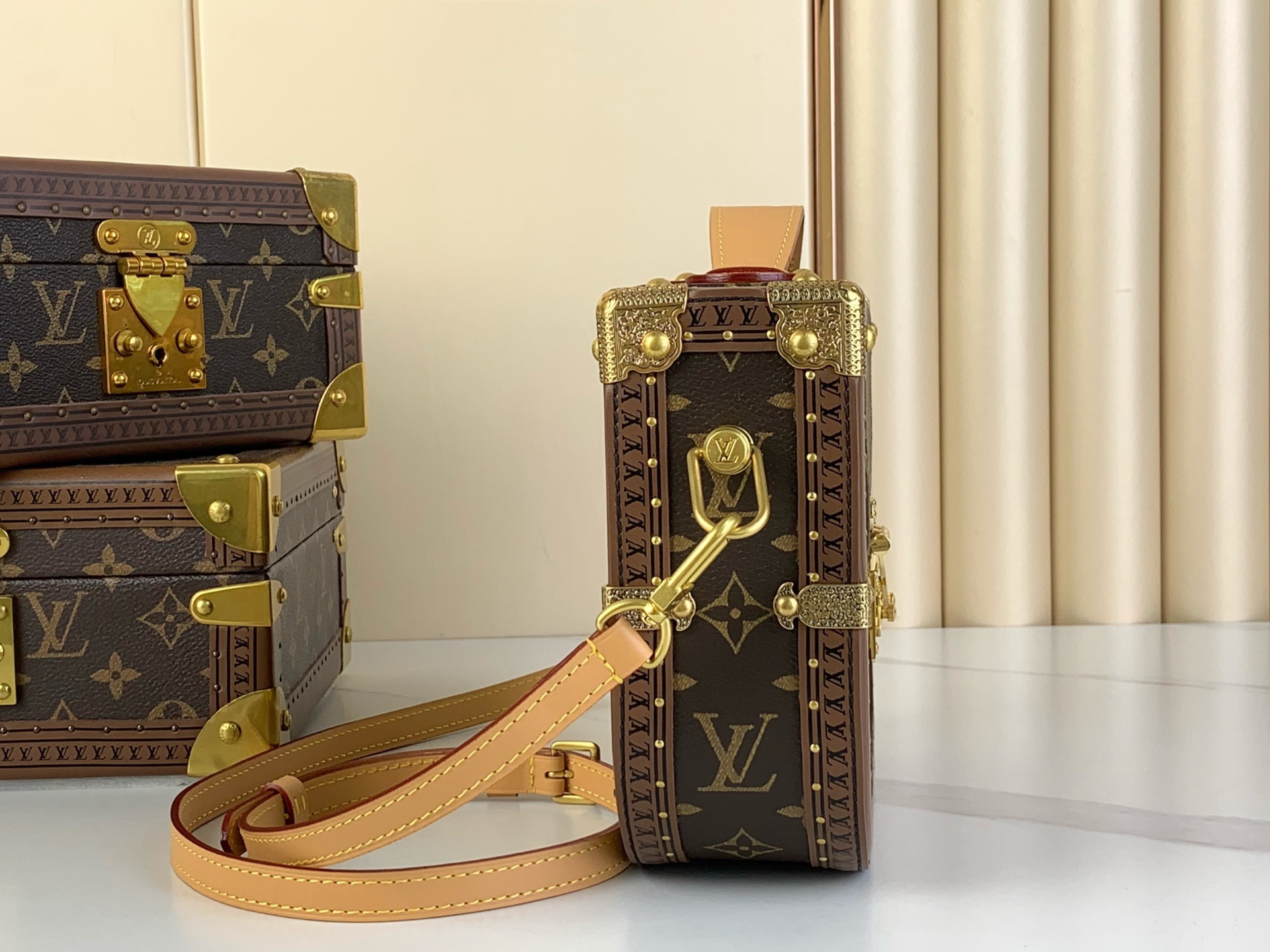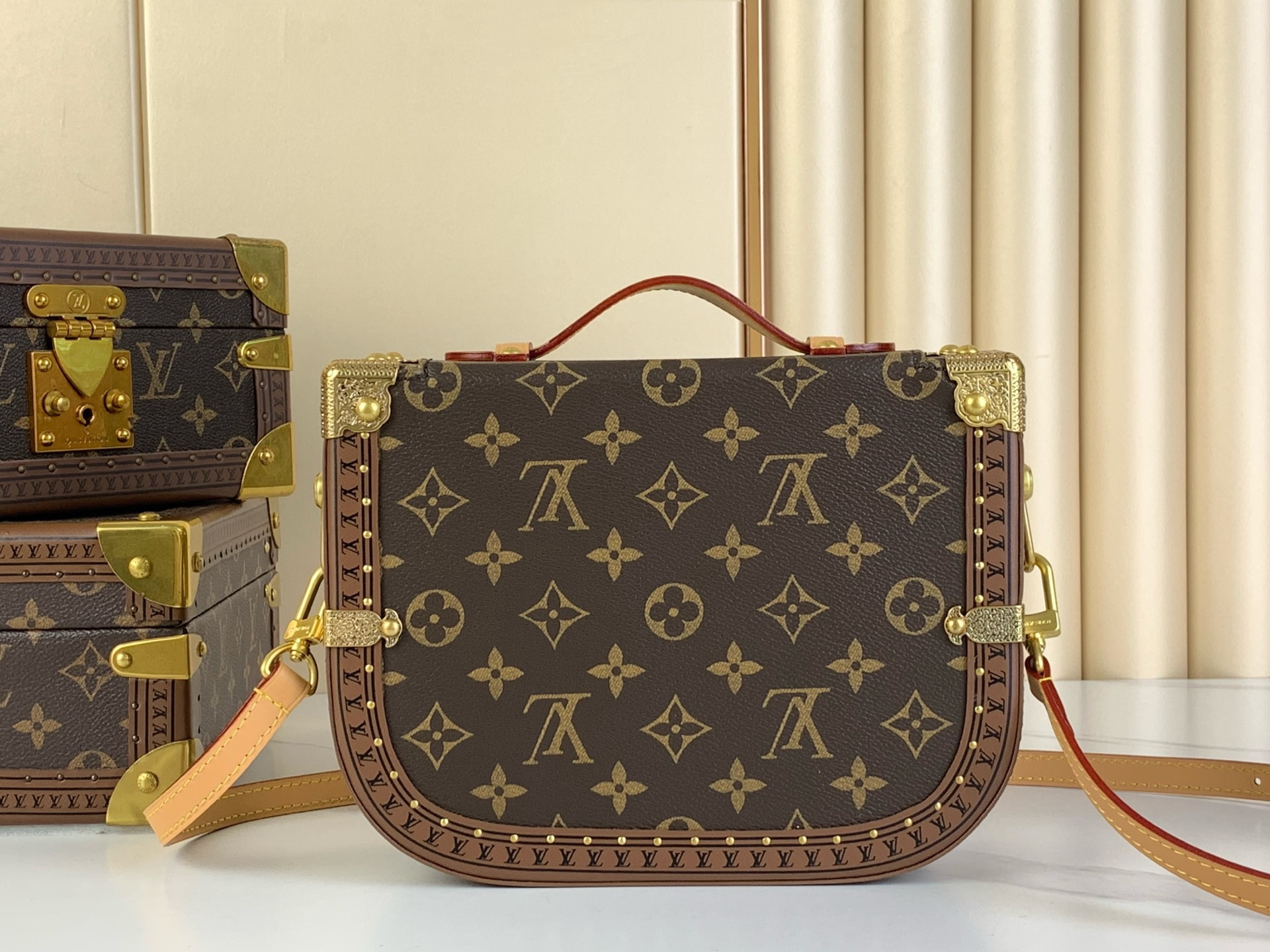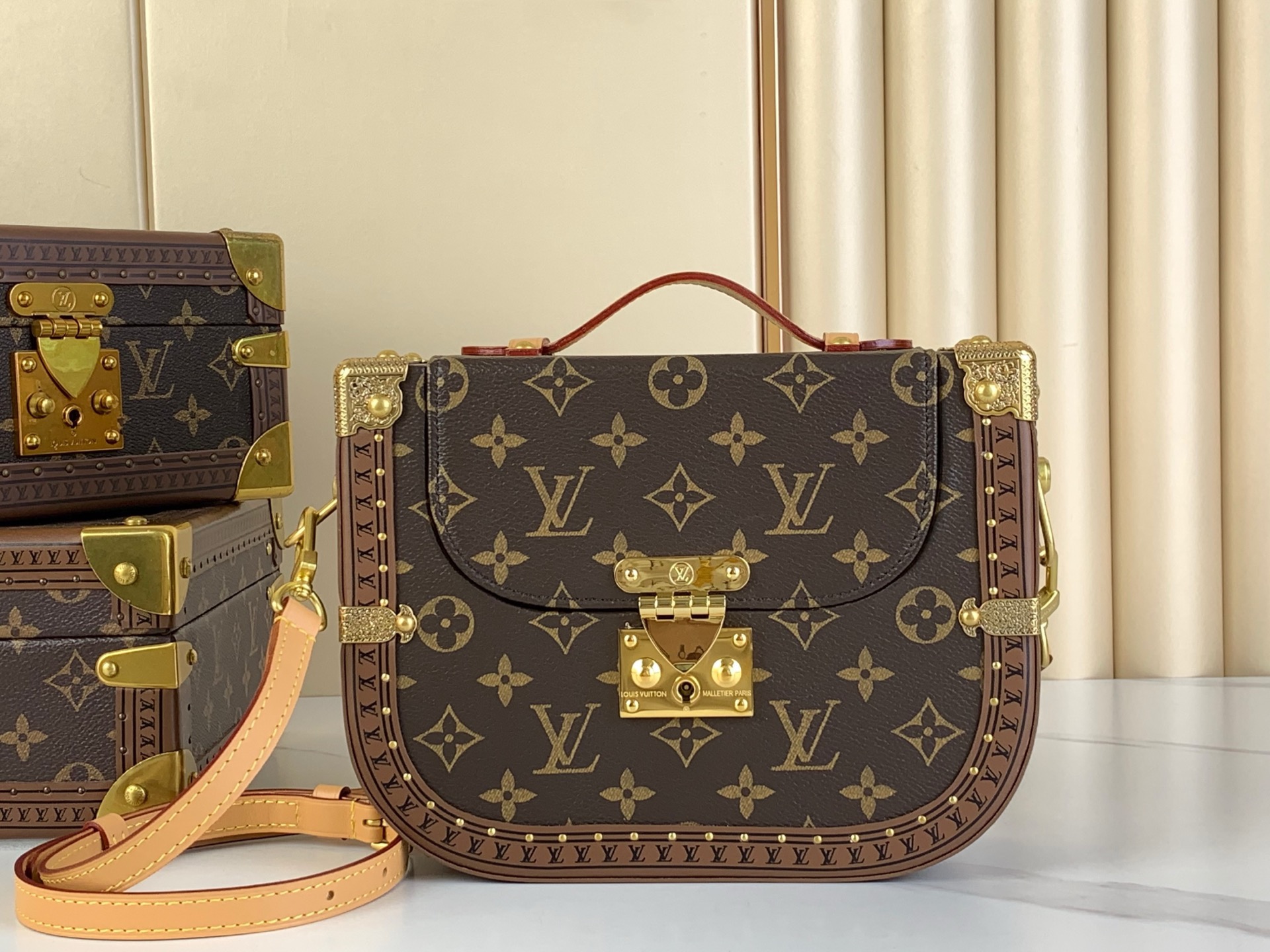 This Montsouris Trunk handbag is made of Monogram canvas and features a rounded and snug design that exudes an elegant style. The flip design, spacious main compartment, and top handle are inspired by the men’s mailman bag, with detachable shoulder straps for flexible carrying.
