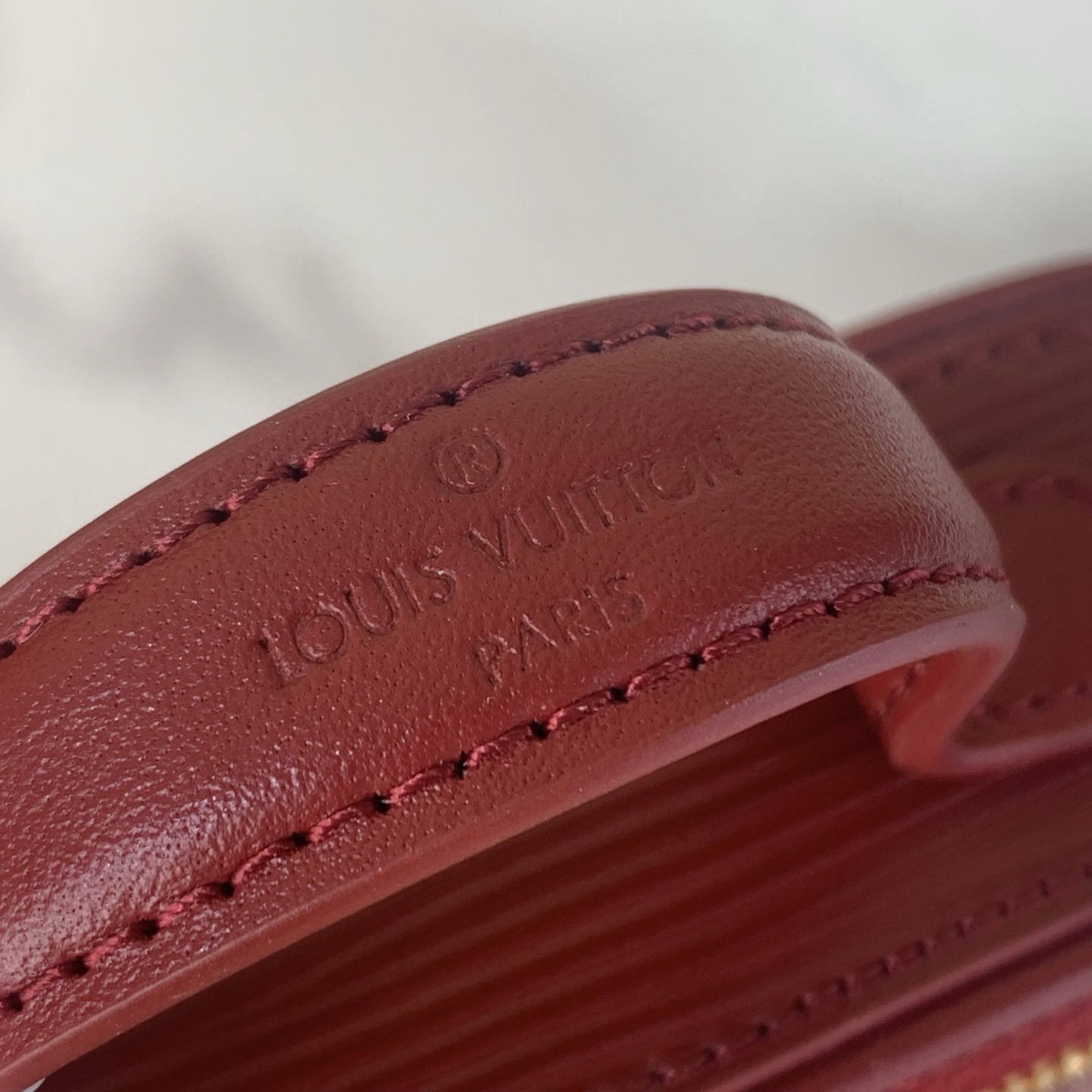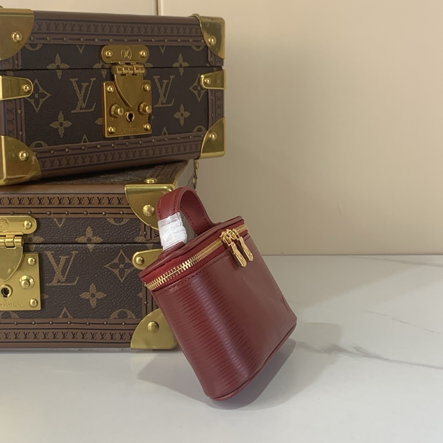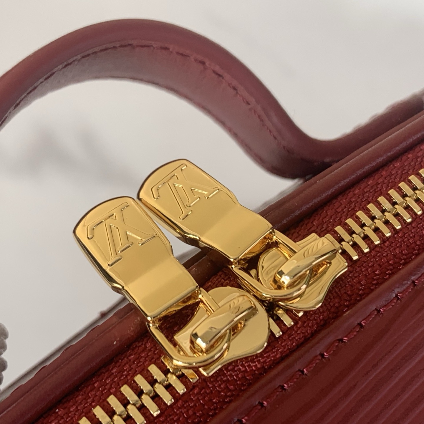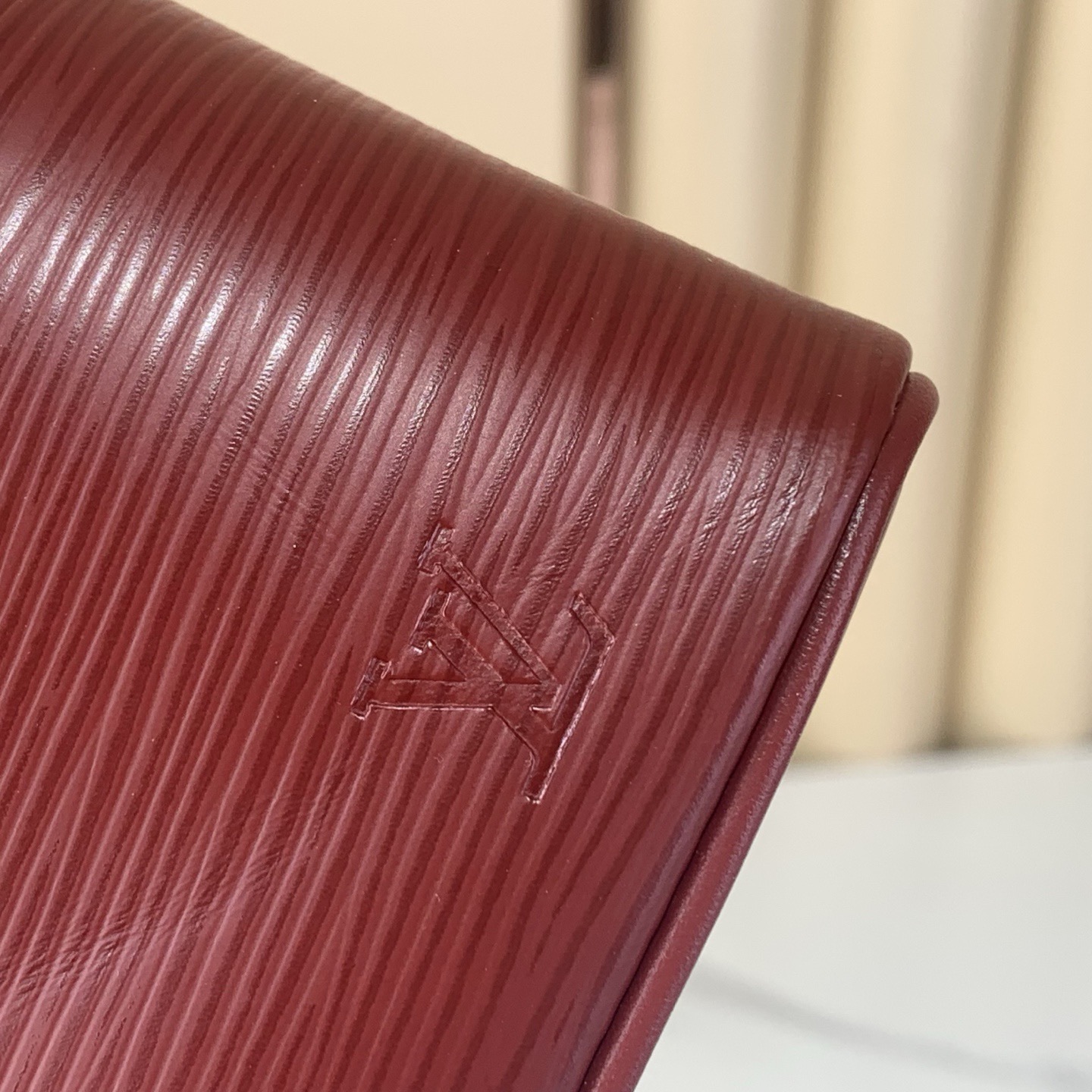 This compact beauty case is crafted from rich burgundy Epi-style textured leather, offering a refined and structured silhouette with a modern touch. The luxurious grain pattern enhances the bag’s visual depth, while gold-tone double zippers add both elegance and secure functionality. Small yet practical, the mini size is perfect for keeping lipsticks, beauty essentials, or small personal items neatly organized.