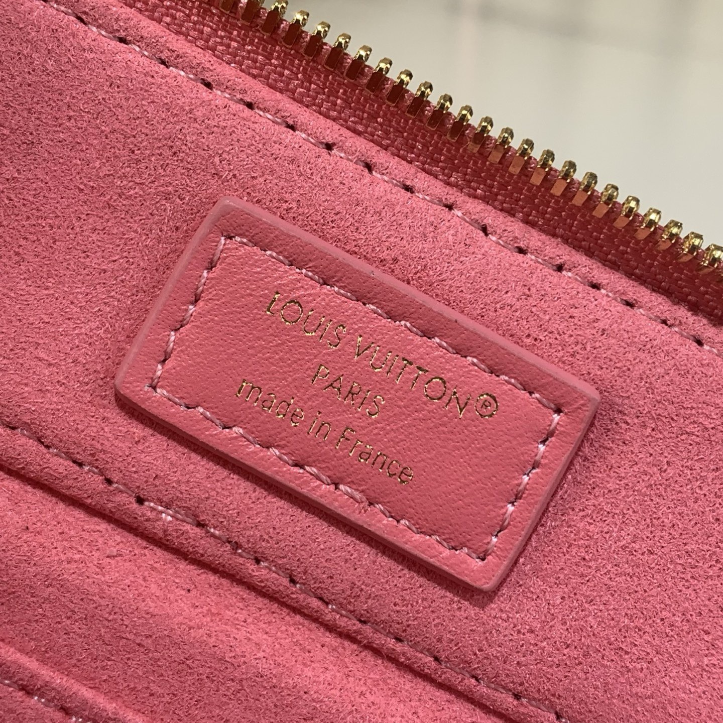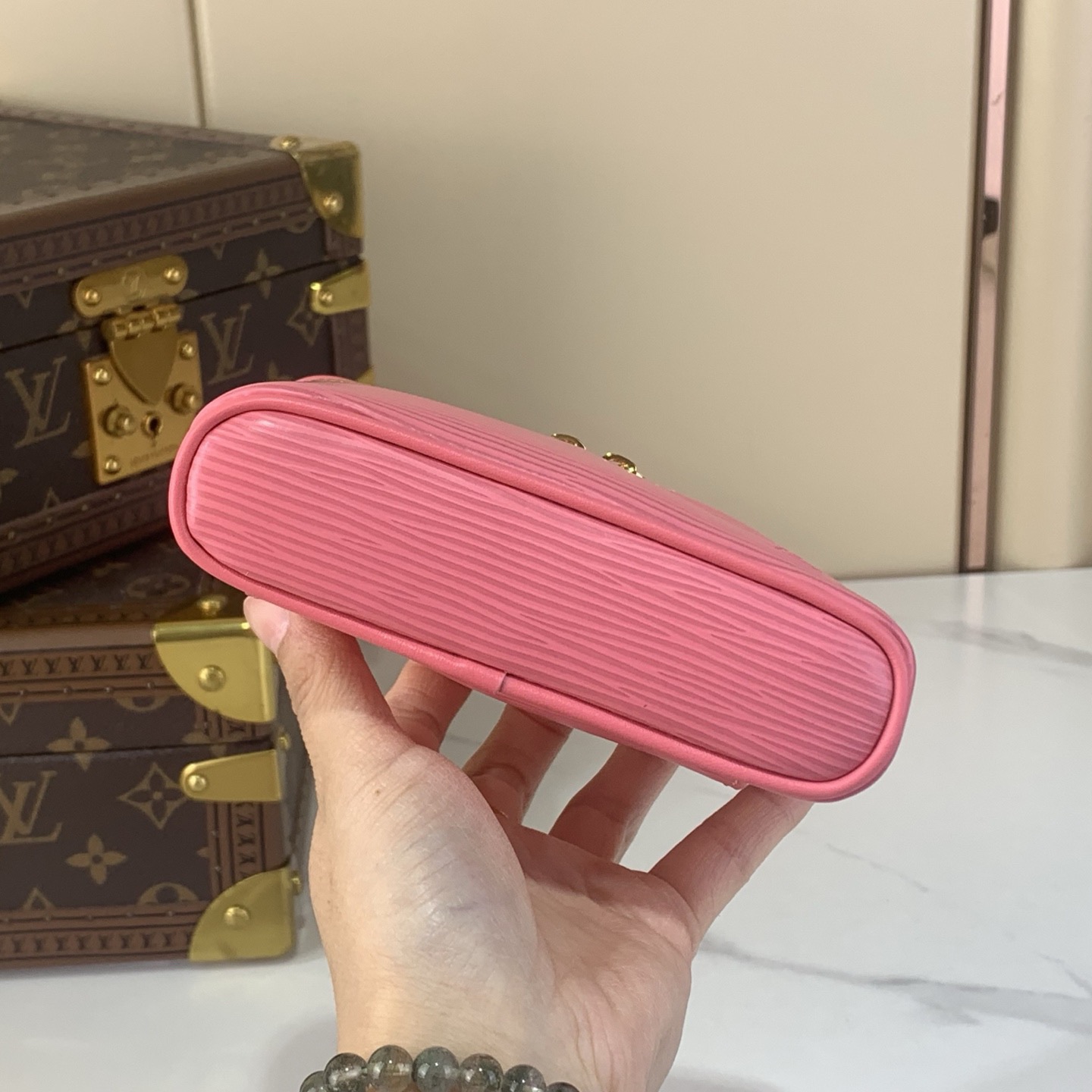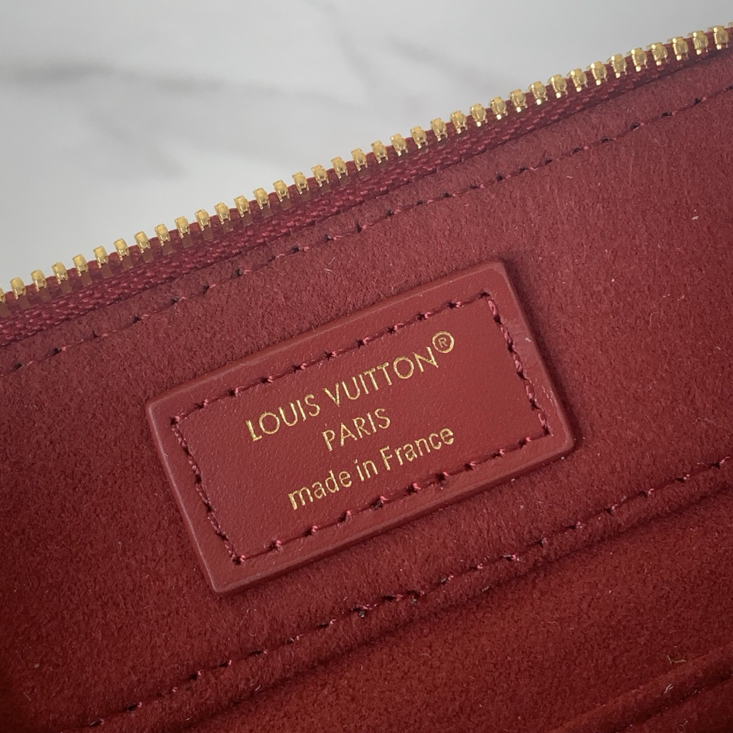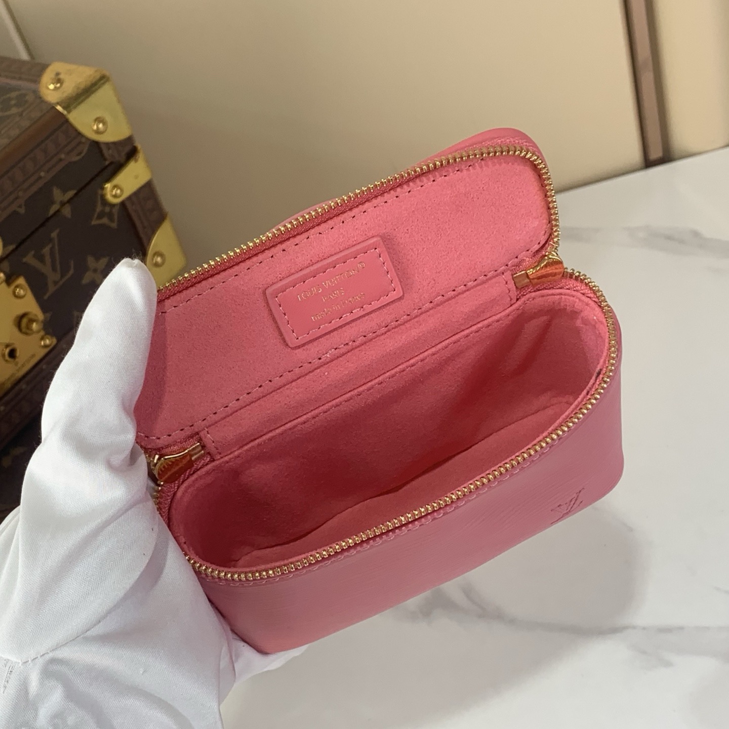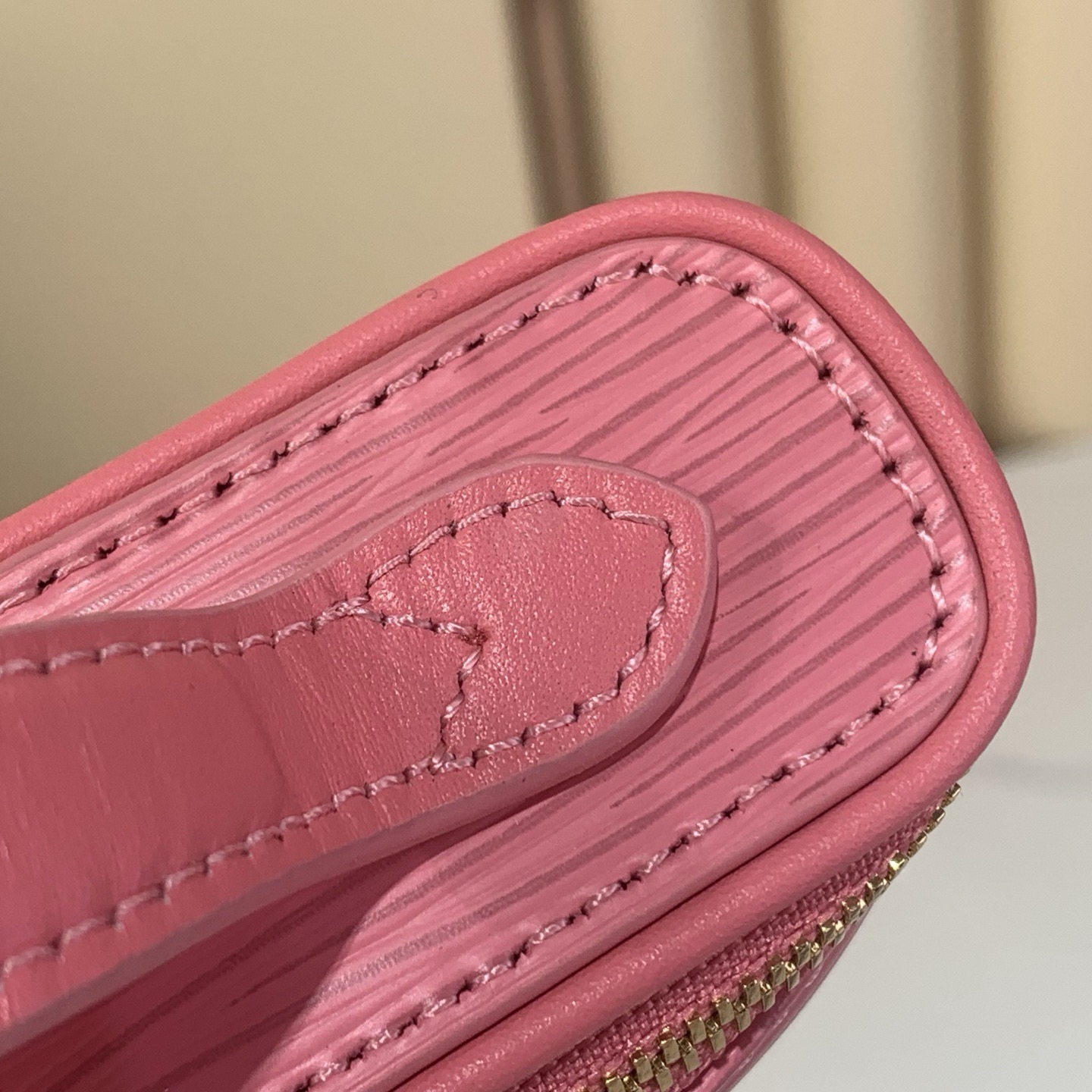This compact beauty case is crafted from rich burgundy Epi-style textured leather, offering a refined and structured silhouette with a modern touch. The luxurious grain pattern enhances the bag’s visual depth, while gold-tone double zippers add both elegance and secure functionality. Small yet practical, the mini size is perfect for keeping lipsticks, beauty essentials, or small personal items neatly organized.