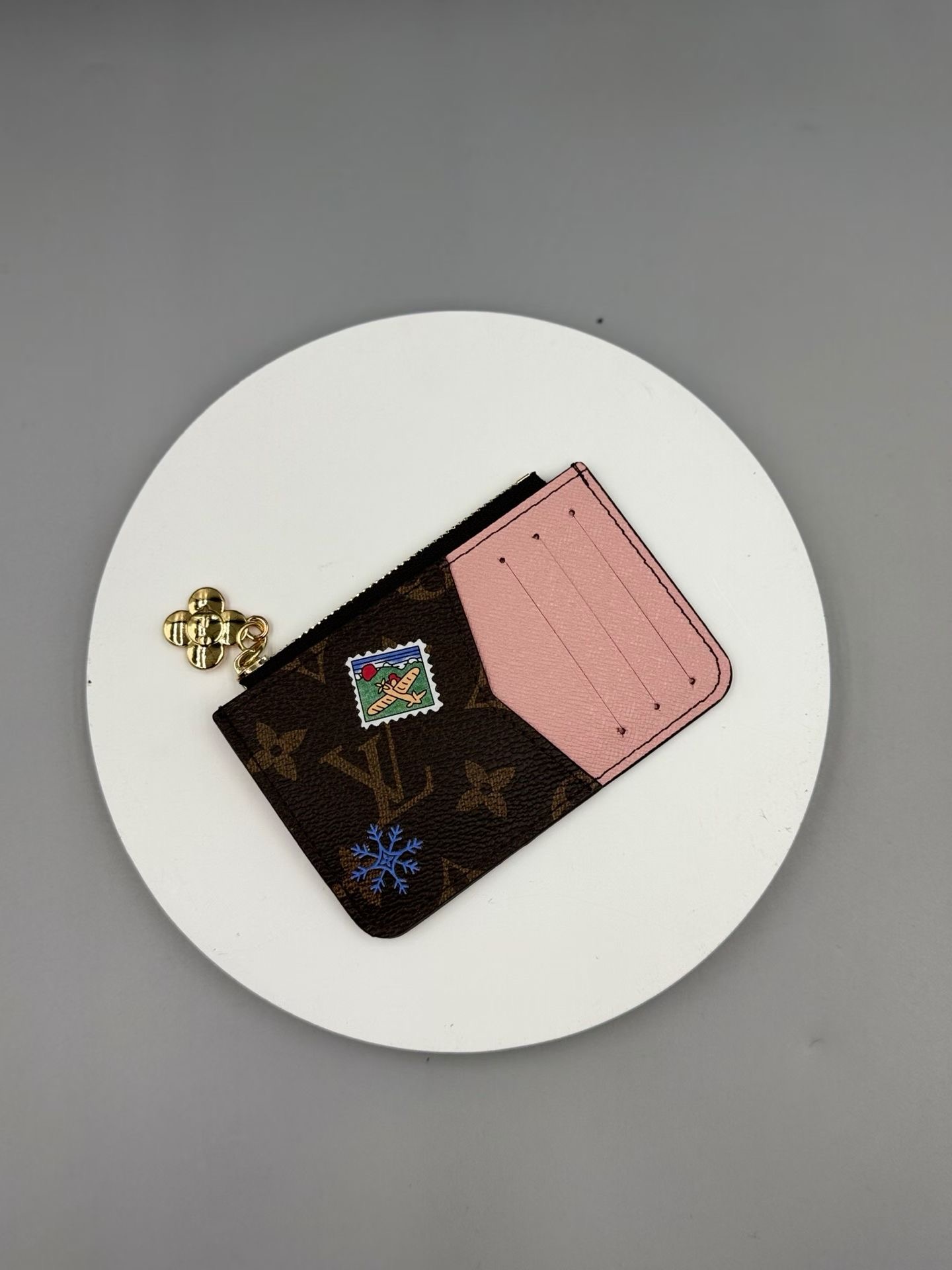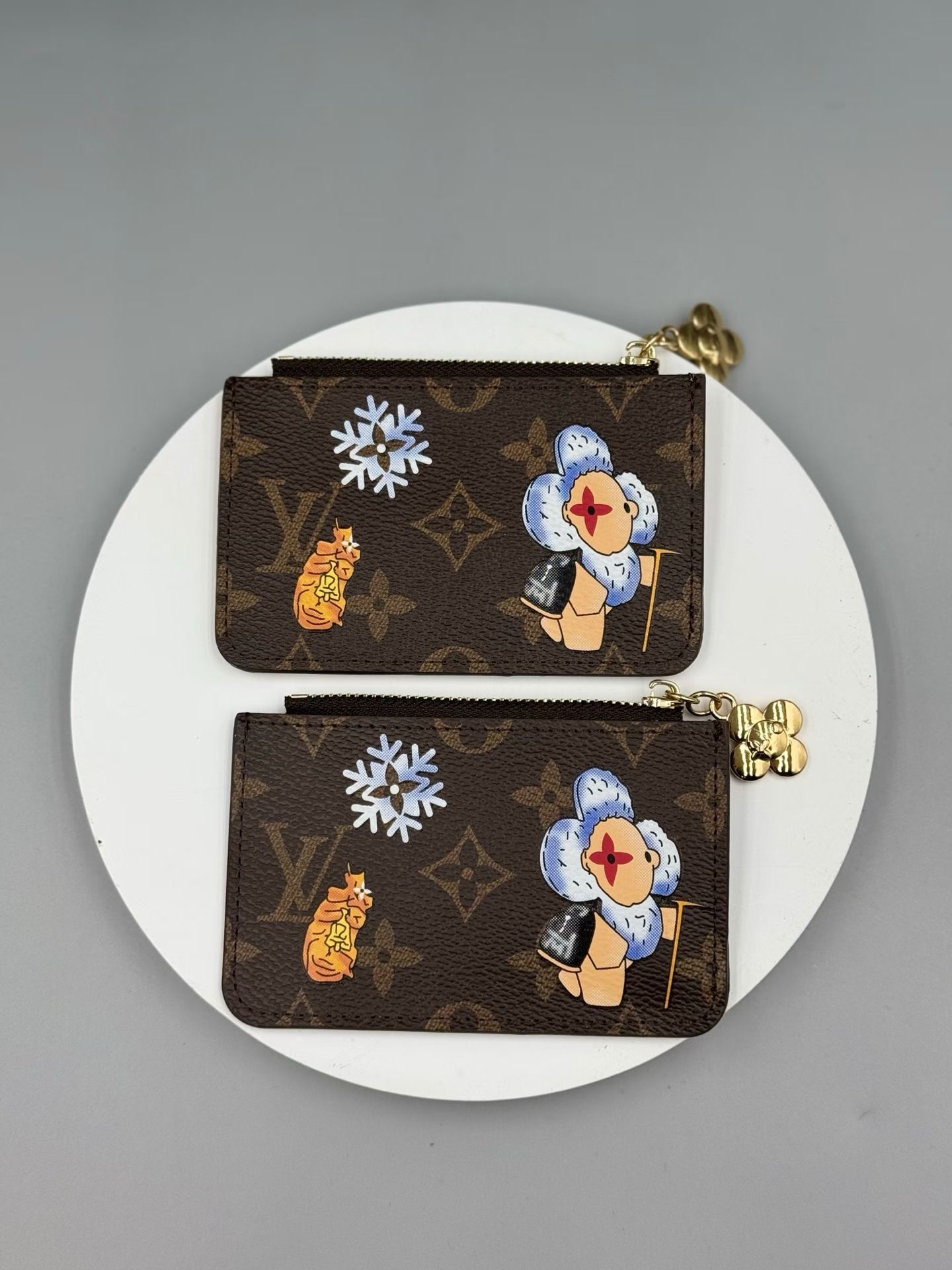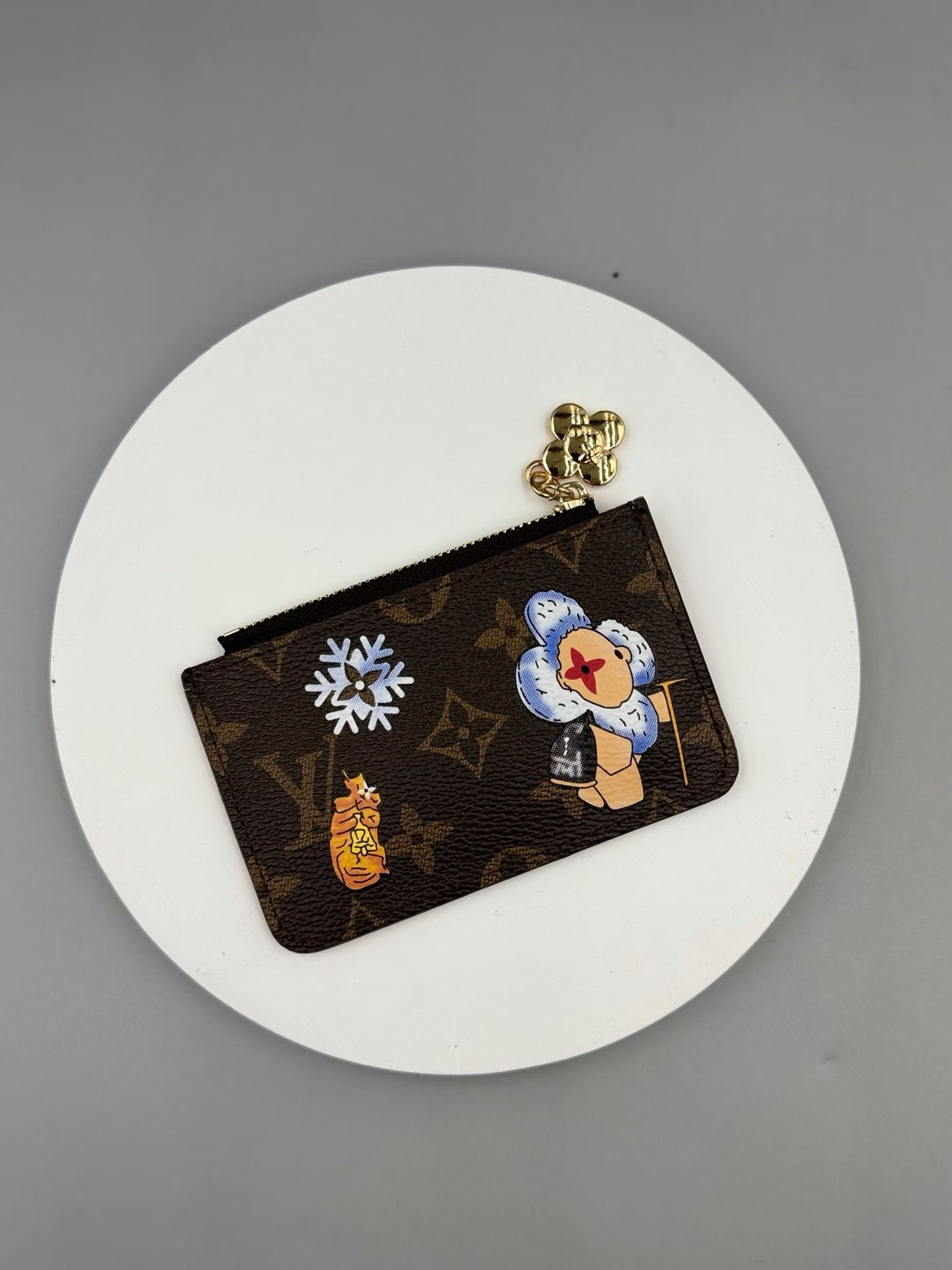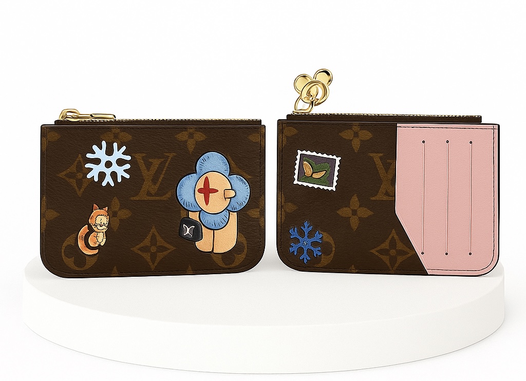 This Romy clip showcases the fun new look of the Vivenne Wintery Travel series. Monogram canvas paired with leather lining, featuring a zipper closure to showcase the brand mascot Vivienne, and featuring card slots, zipper change pockets, and banknote stickers.