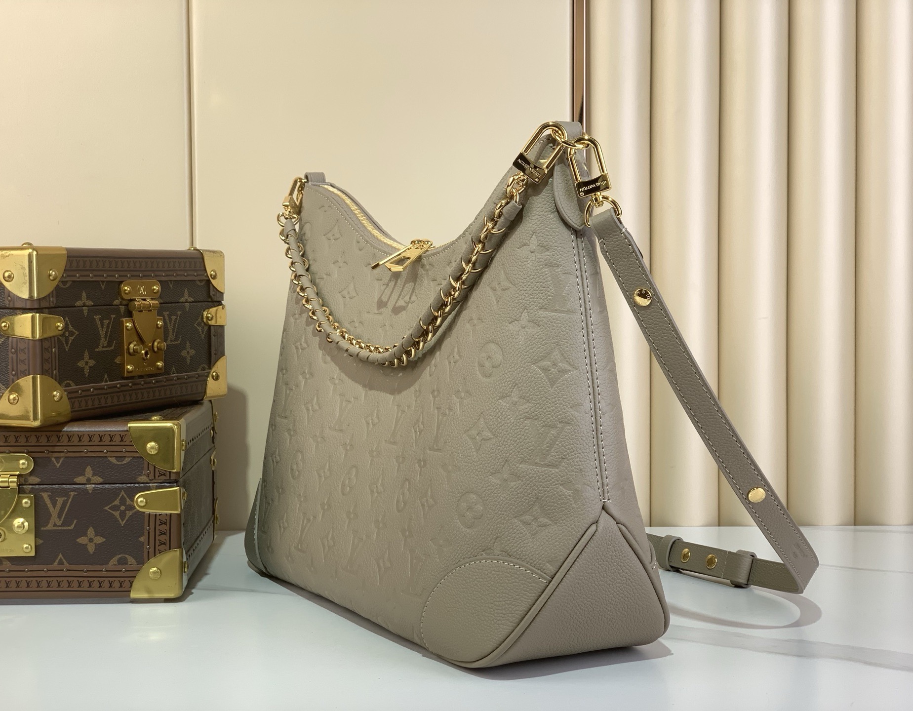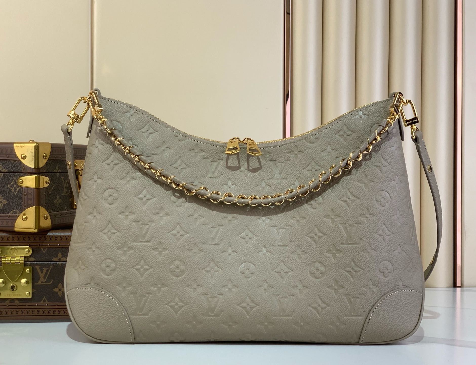 This classic Boulogne bag is available in a spacious universal format this season, making it perfect for carrying laptops and other essentials. Inspired by a 1984 archival work, this elegant model is made of Monogram Impronte leather and complemented by a detachable gold woven chain. It can be worn cross over, shoulder back, or by hand.