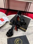 (Sandal) Sandal with open toes. Elegantly reveals the feet. This platform sandal designed by Maison C L features a slender ankle strap and a 130mm square heel. It is entirely made of black shiny calfskin. Size: 34-42 (34.40.41.42. Custom-made) 202372-5600 Heel height: 13cm