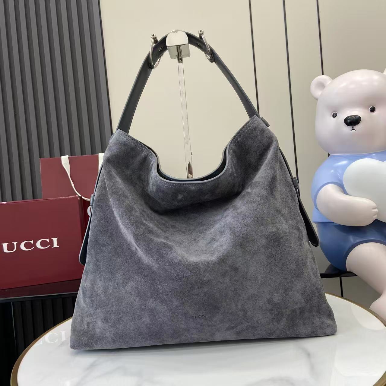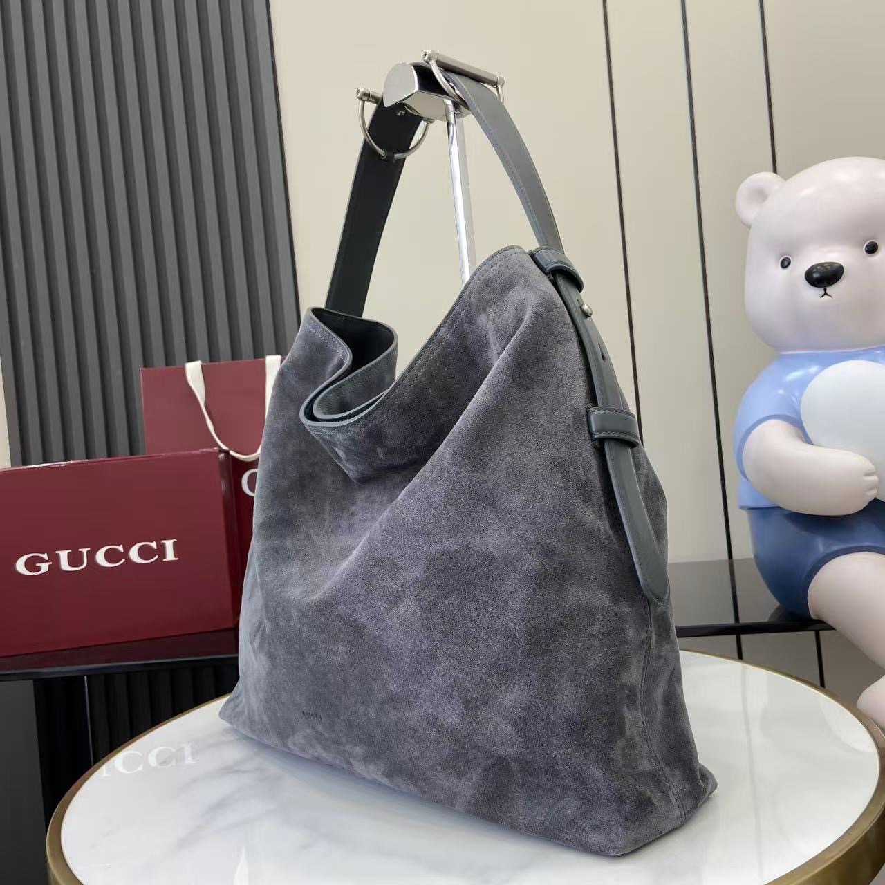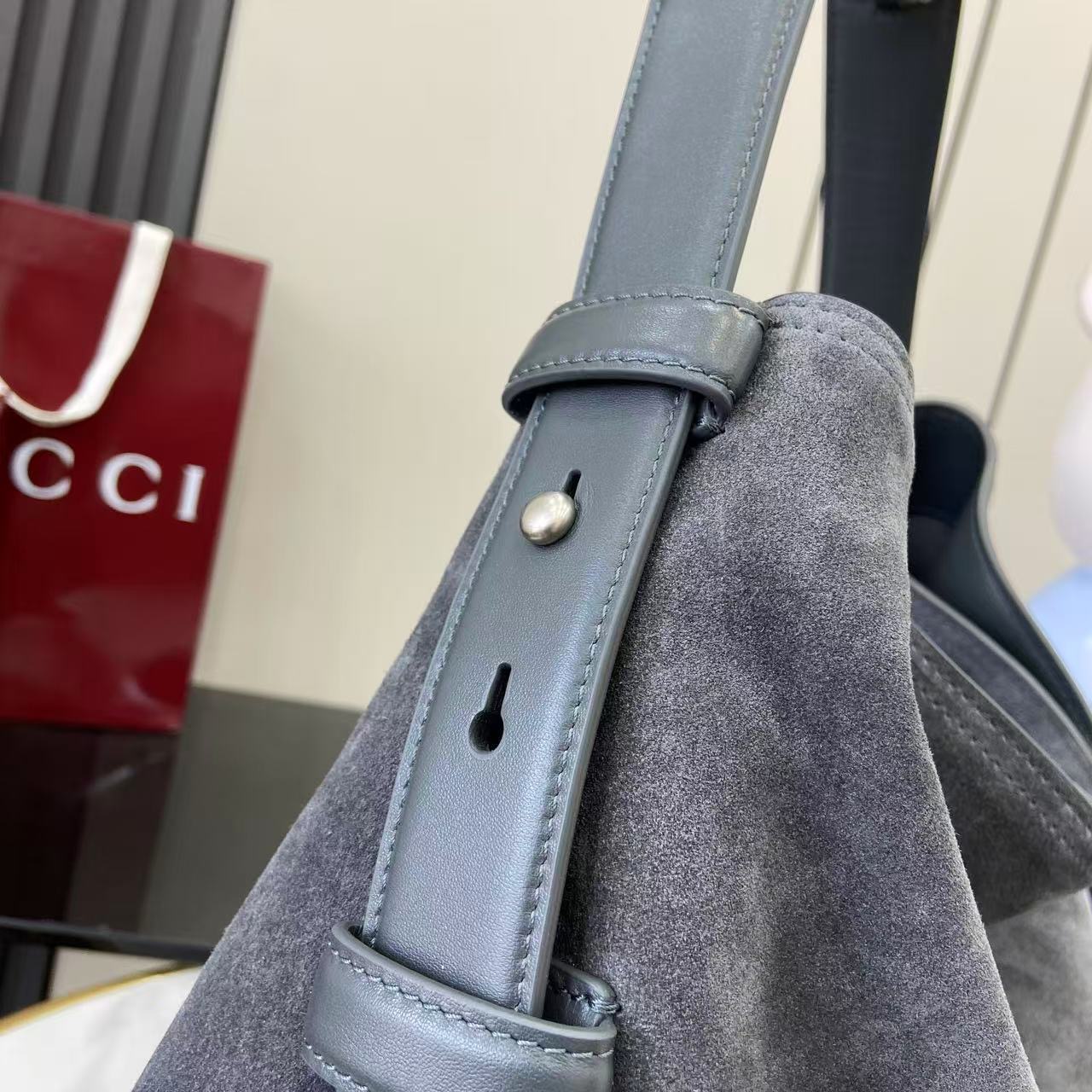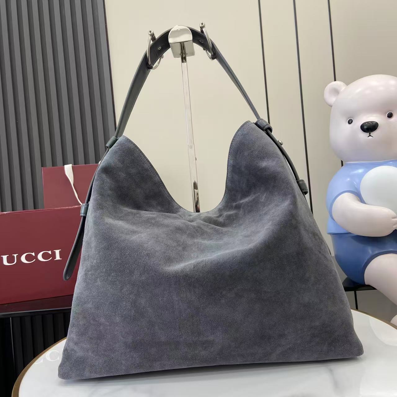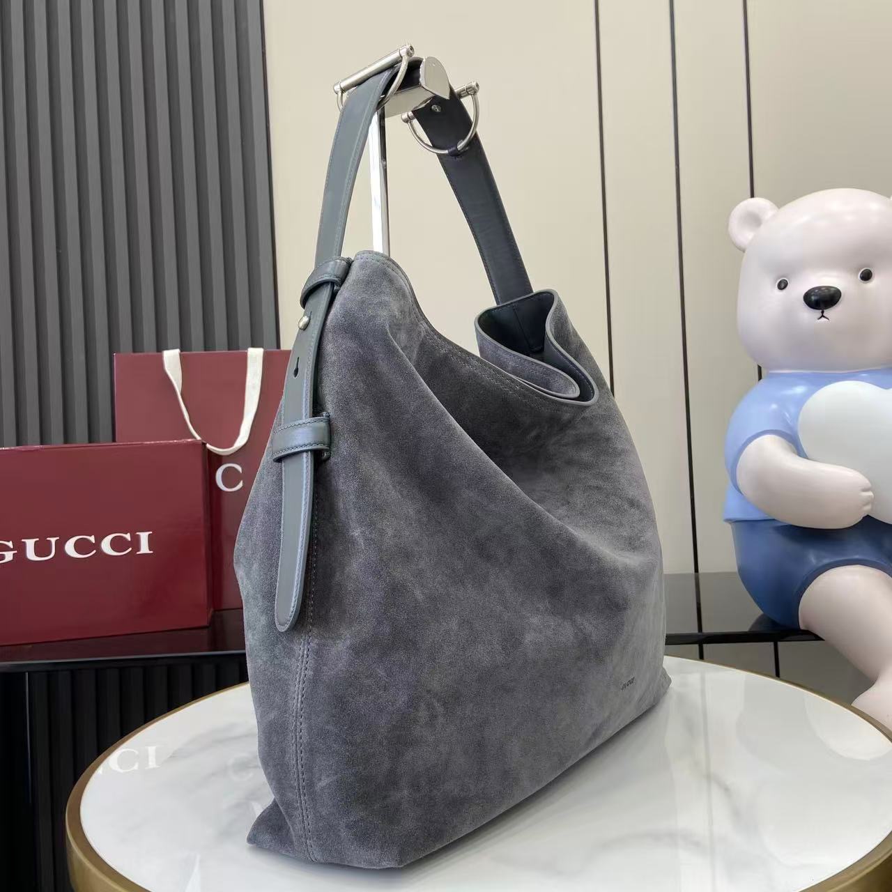 The shoulder strap is enhanced with a subtle equestrian-inspired metal accent, giving the design a distinctive highlight while maintaining a clean, minimalist balance. The golden-toned hardware adds warmth to the cool grey suede, creating a harmonious contrast that elevates the overall look without overwhelming the softness of the material. Lightweight yet substantial, this large hobo bag provides excellent capacity for day-to-day necessities.