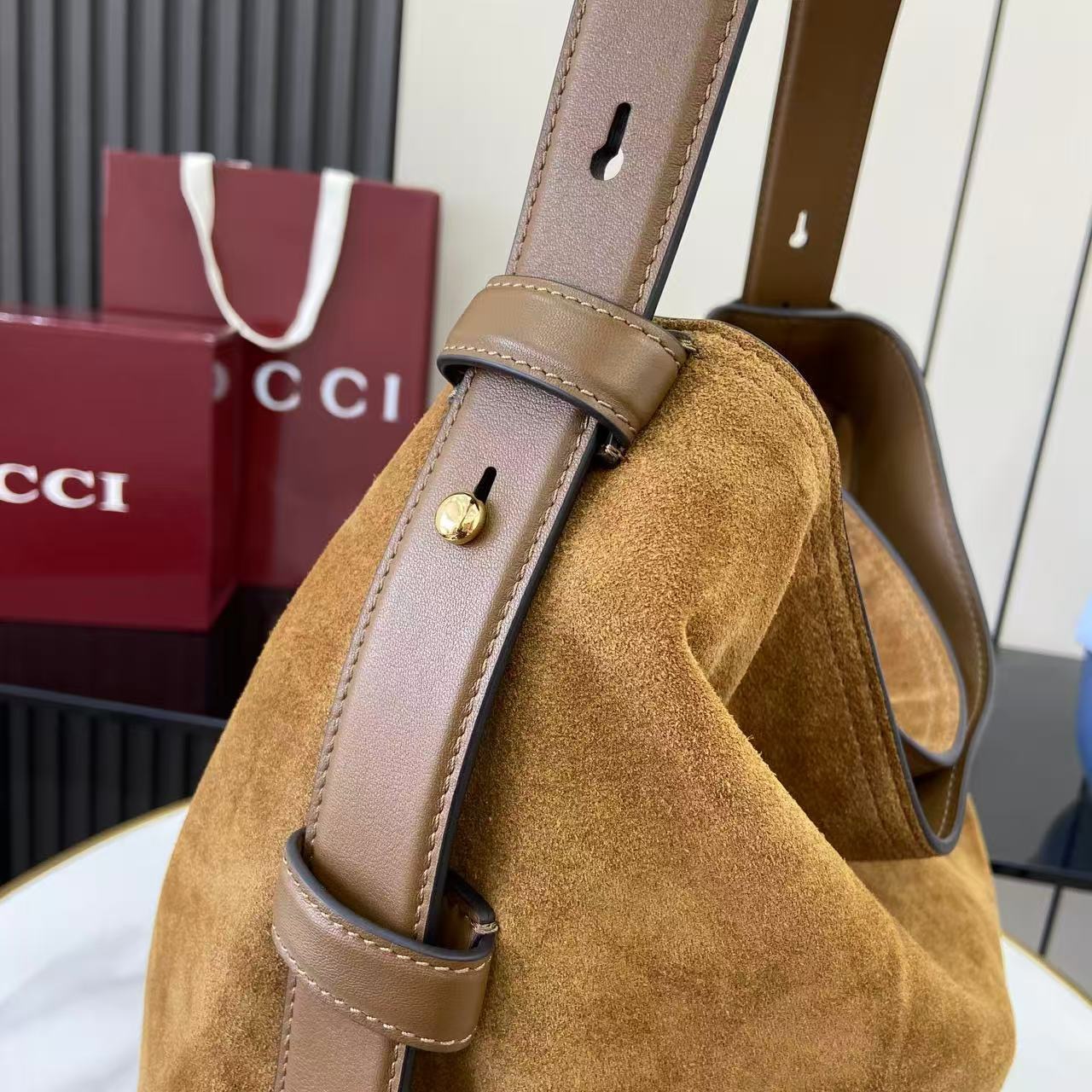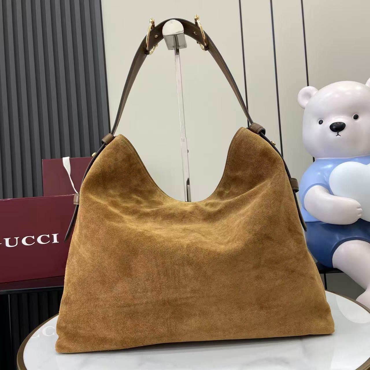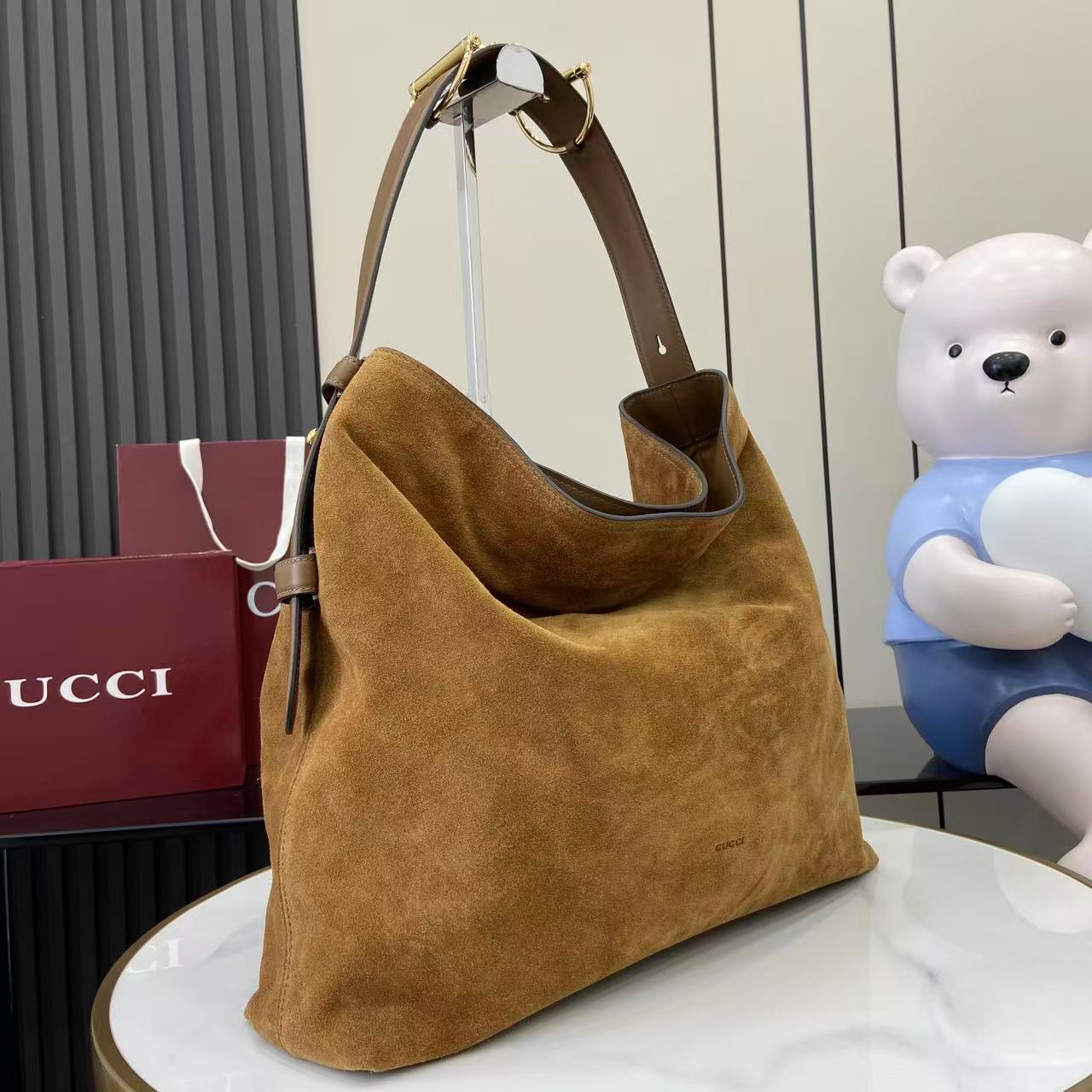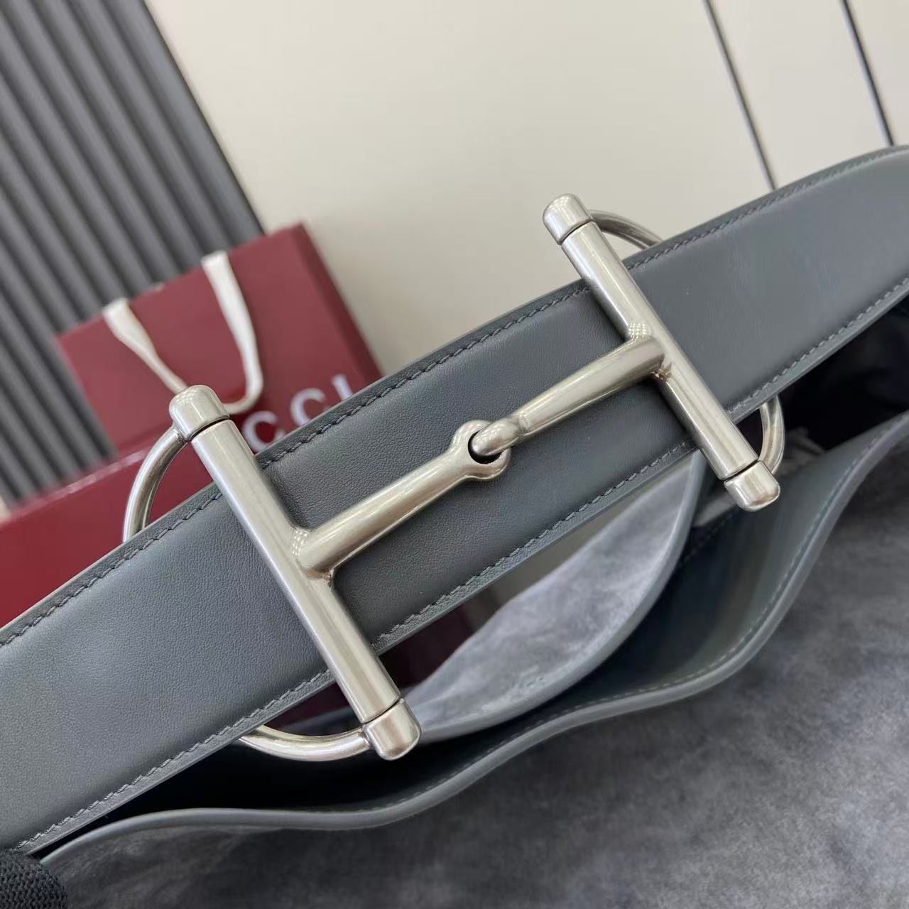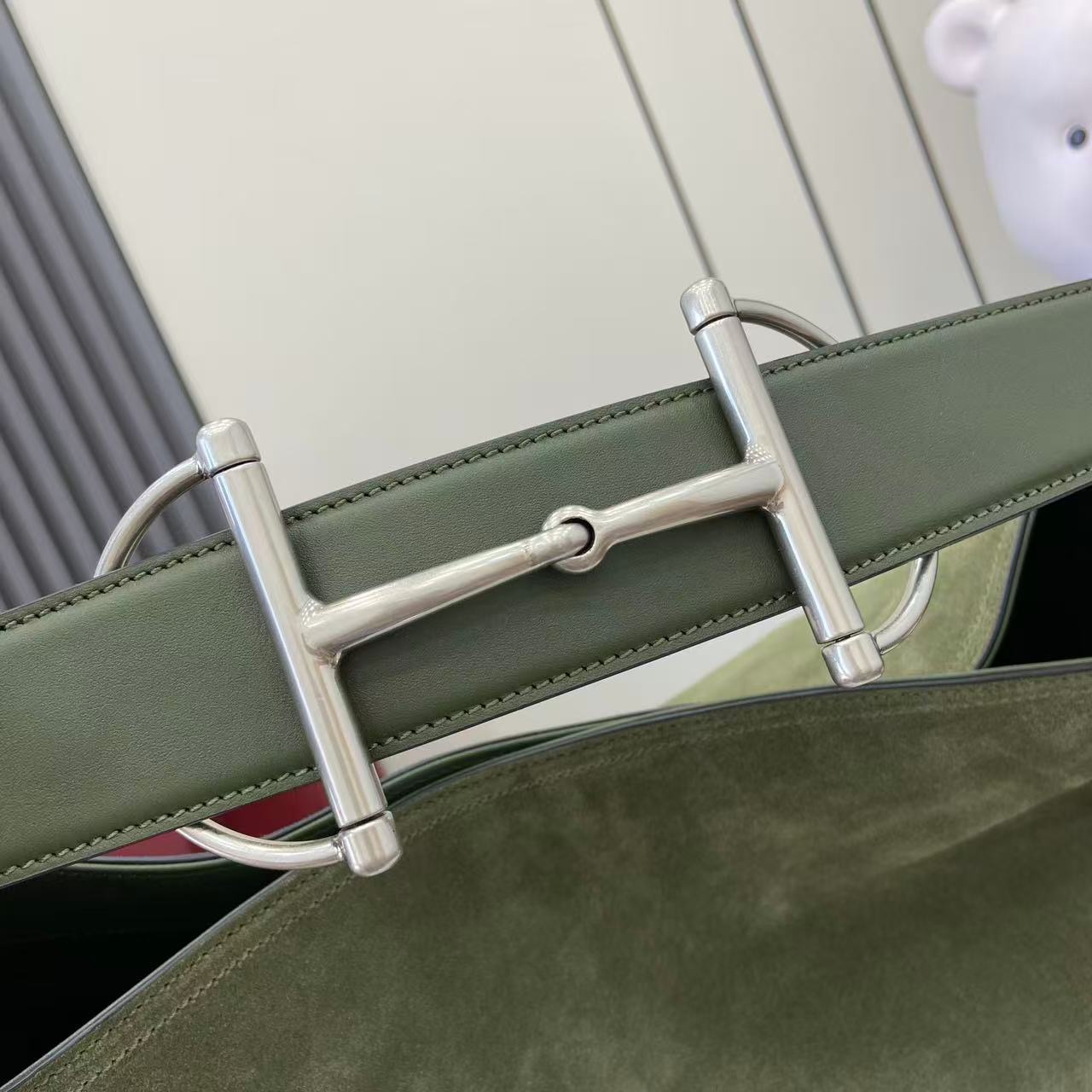 The shoulder strap is enhanced with a subtle equestrian-inspired metal accent, giving the design a distinctive highlight while maintaining a clean, minimalist balance. The golden-toned hardware adds warmth to the cool grey suede, creating a harmonious contrast that elevates the overall look without overwhelming the softness of the material. Lightweight yet substantial, this large hobo bag provides excellent capacity for day-to-day necessities.
