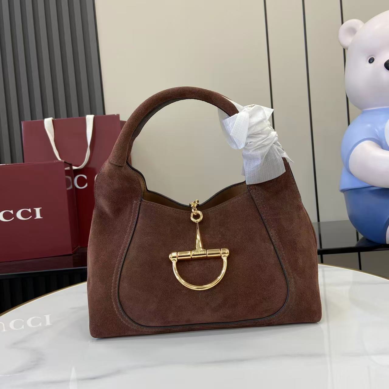 Soft Suede Medium Hobo Bag 837467 in dark brown suede with a semi-ring clasp and soft structured silhouette.