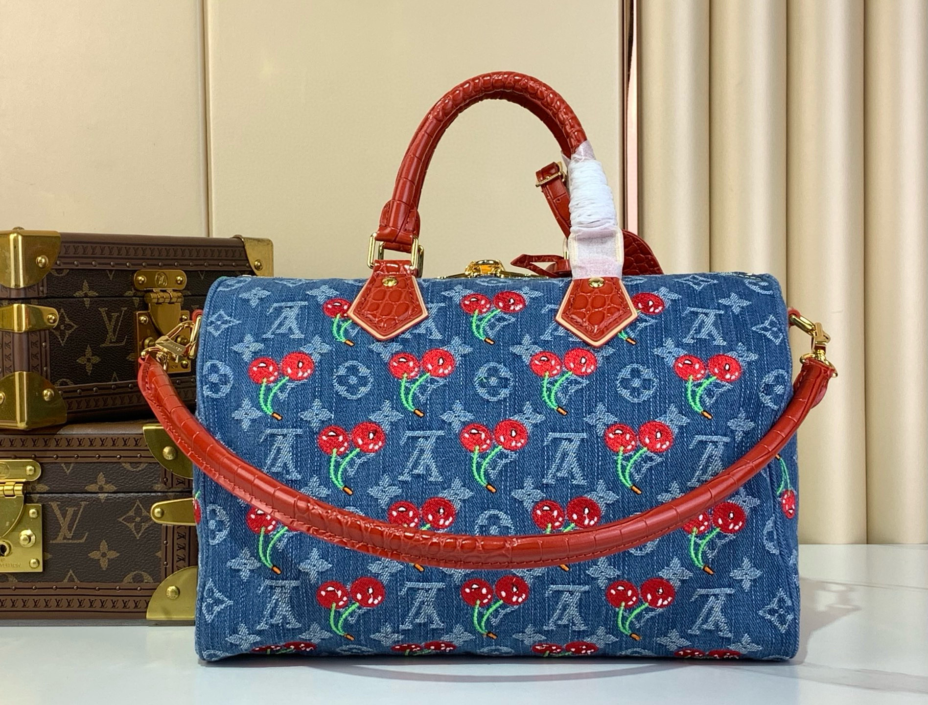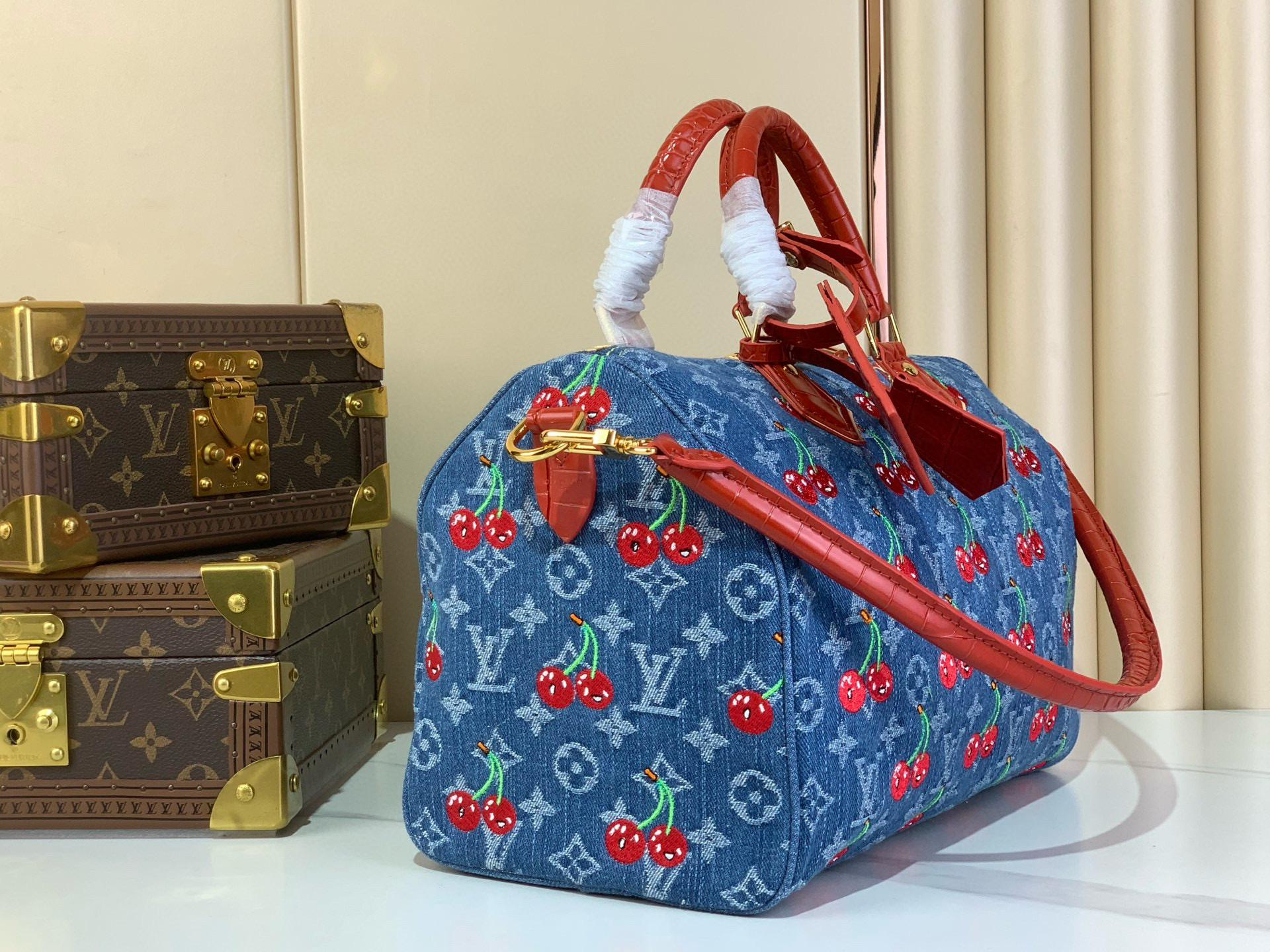 [Speedy Soft 30 Handbag] M87627 Cowboy/Cherry This Speedy Soft 30 handbag relies on exquisite bleaching technology to trace the Monogram Denim pattern born in 2005 on the cotton surface, and then highlights the details with leather trim and glossy metal pieces. The keybag and detachable brand pay tribute to the brand box inheritance, and the detachable Toron handle achieves a comfortable shoulder and back experience. Size: 30.0 x 21.0 x 17.0cm (length x height x width)