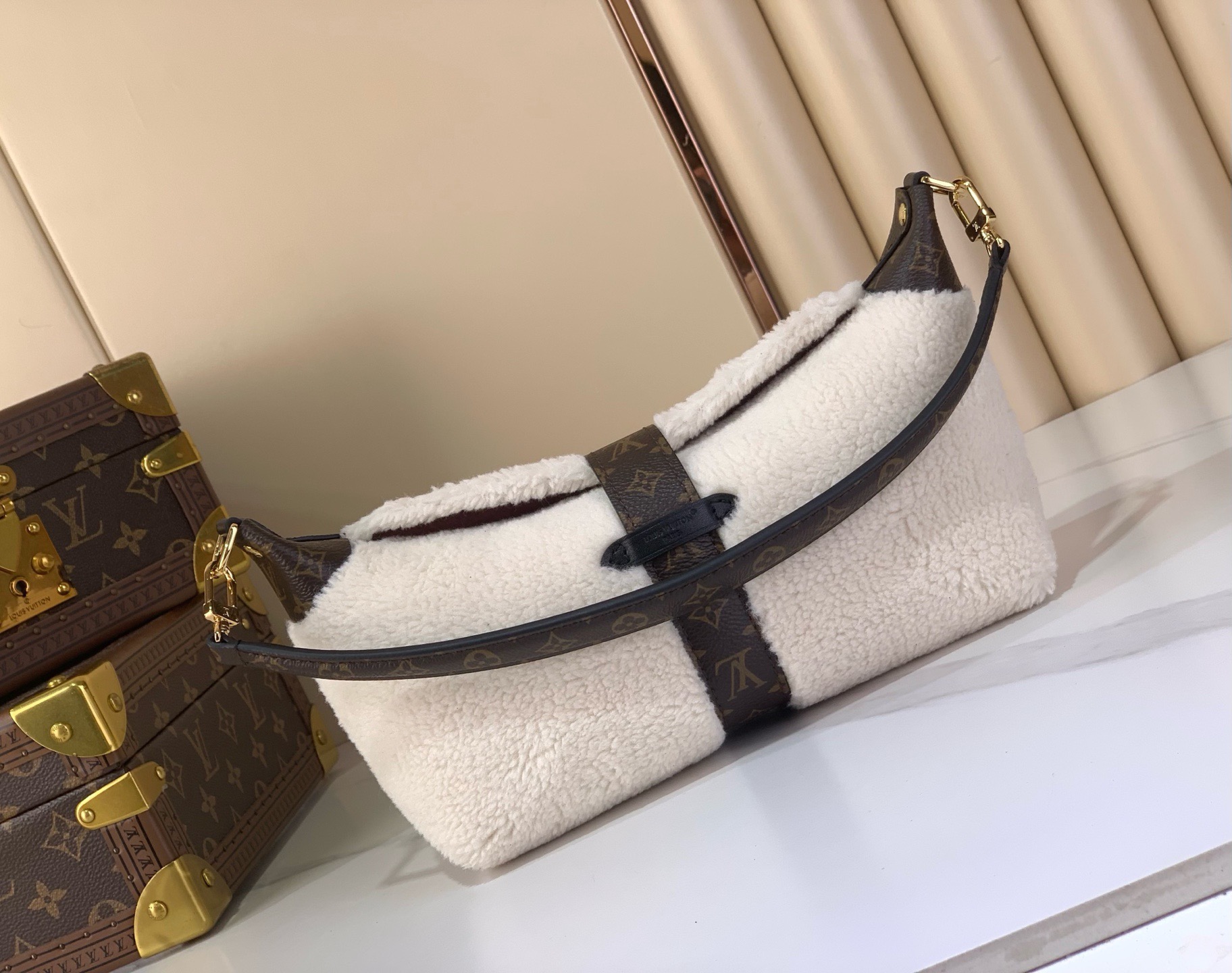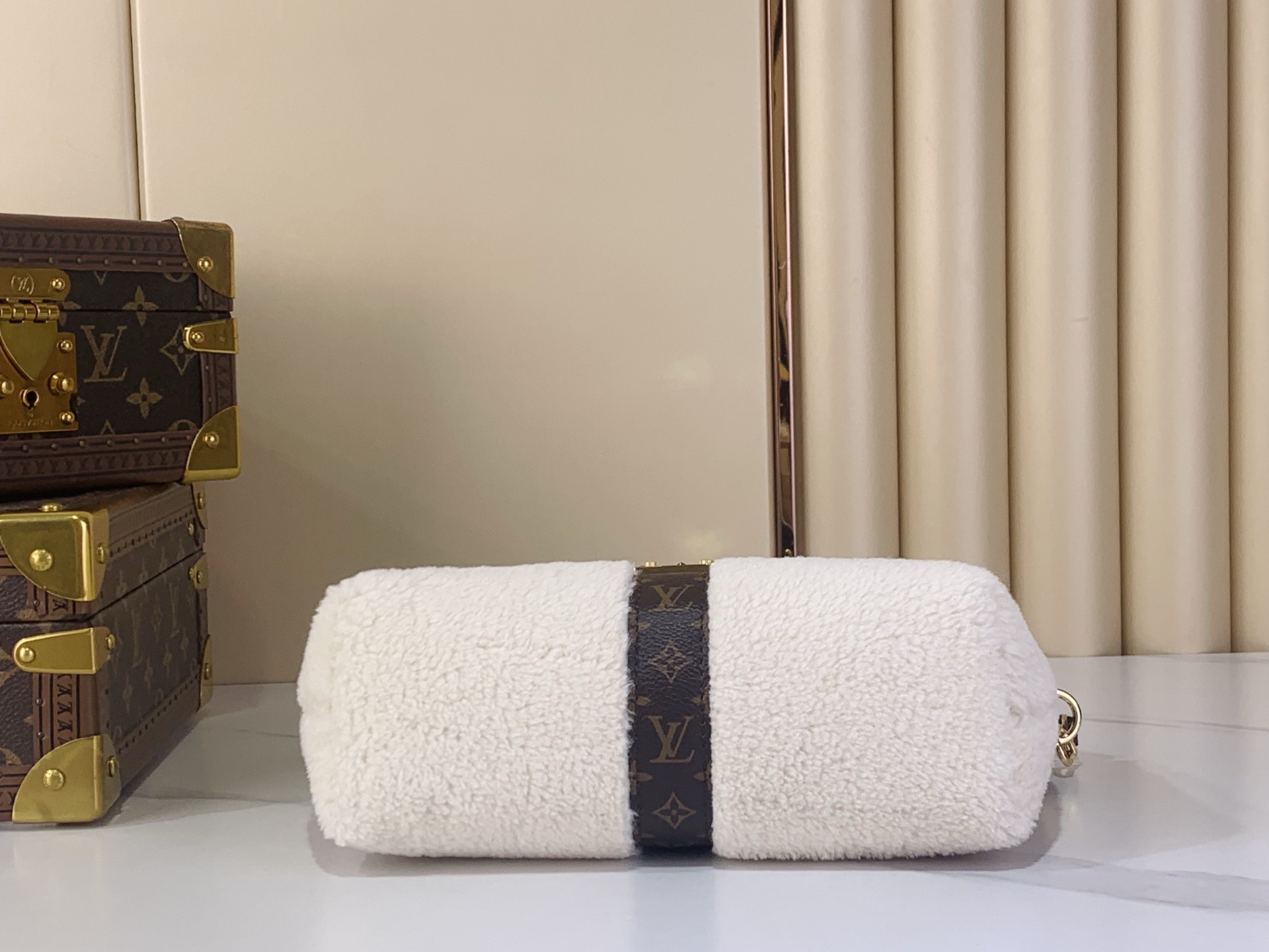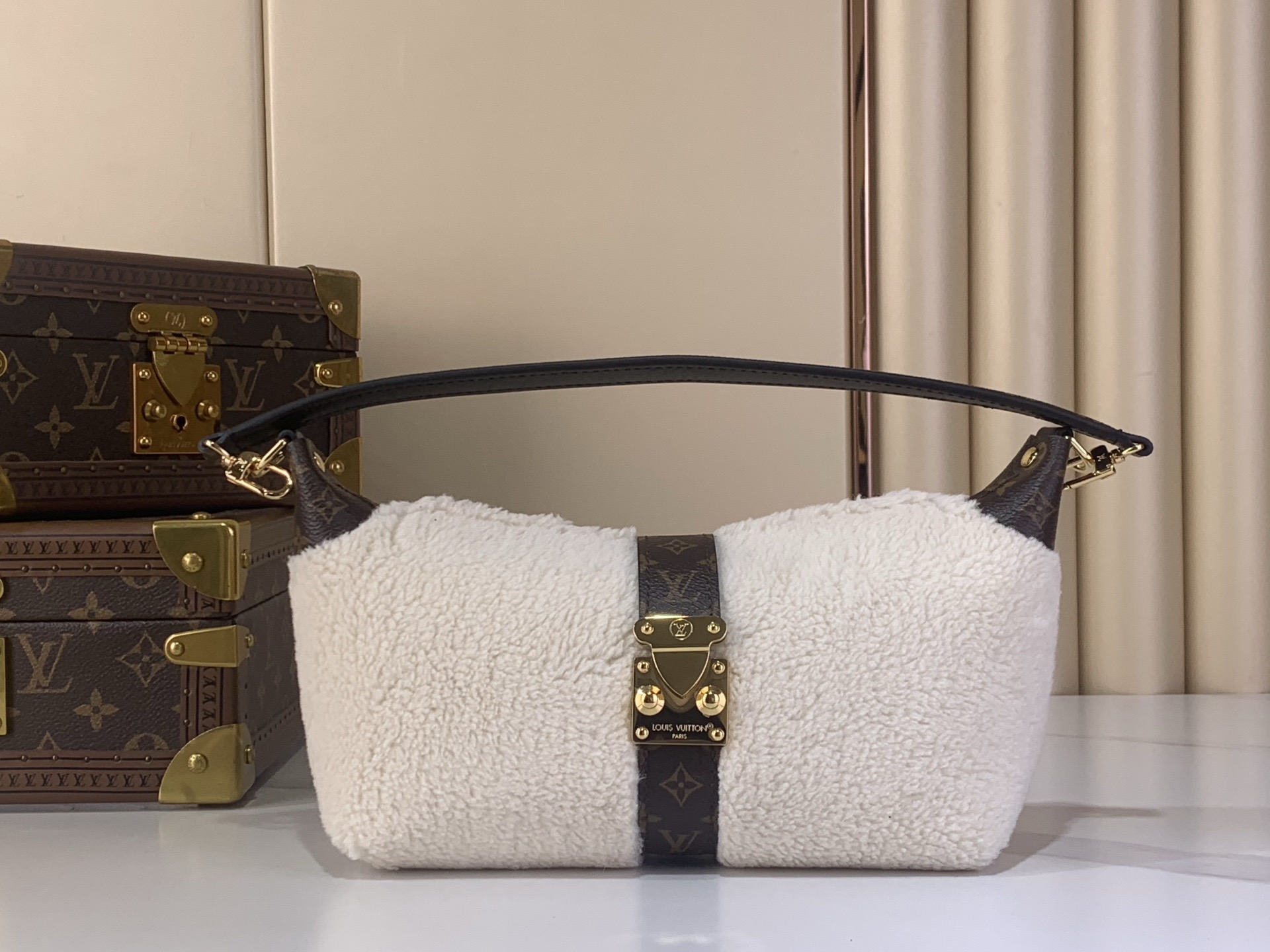 Shearling shoulder bag with monogram canvas trim and an S-lock–style magnetic clasp. Soft, lightweight, and perfect for daily essentials—designed with a removable leather handle for versatile styling. Size:22 × 14.5 × 8 cm