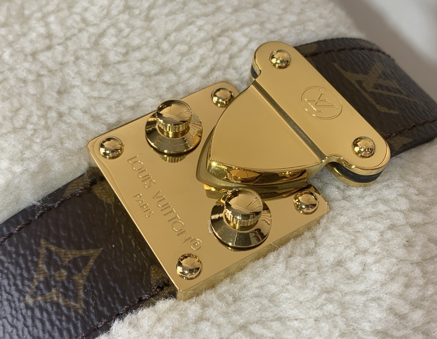 This cozy and stylish shoulder bag features a plush shearling body paired with monogram-style coated canvas accents, creating a soft yet structured silhouette. The center leather band is finished with a polished S-lock–style magnetic closure, adding both security and a refined touch. Its compact shape easily fits daily essentials such as a phone, wallet, keys, and small accessories.