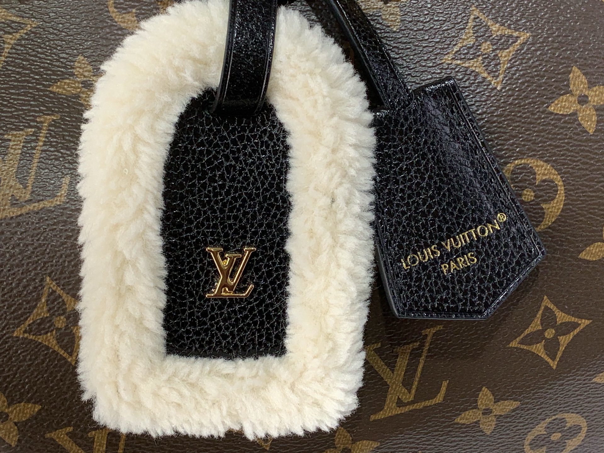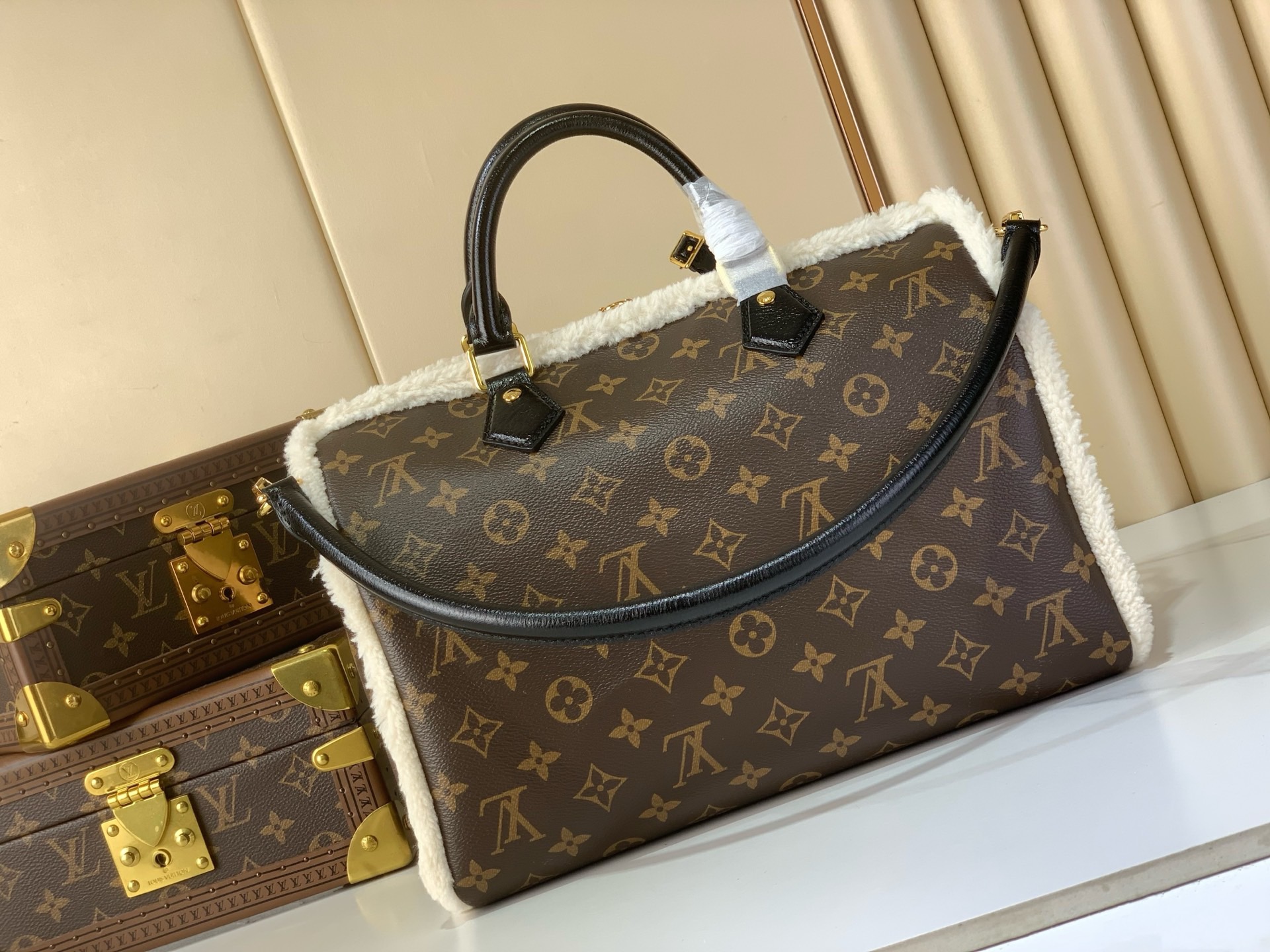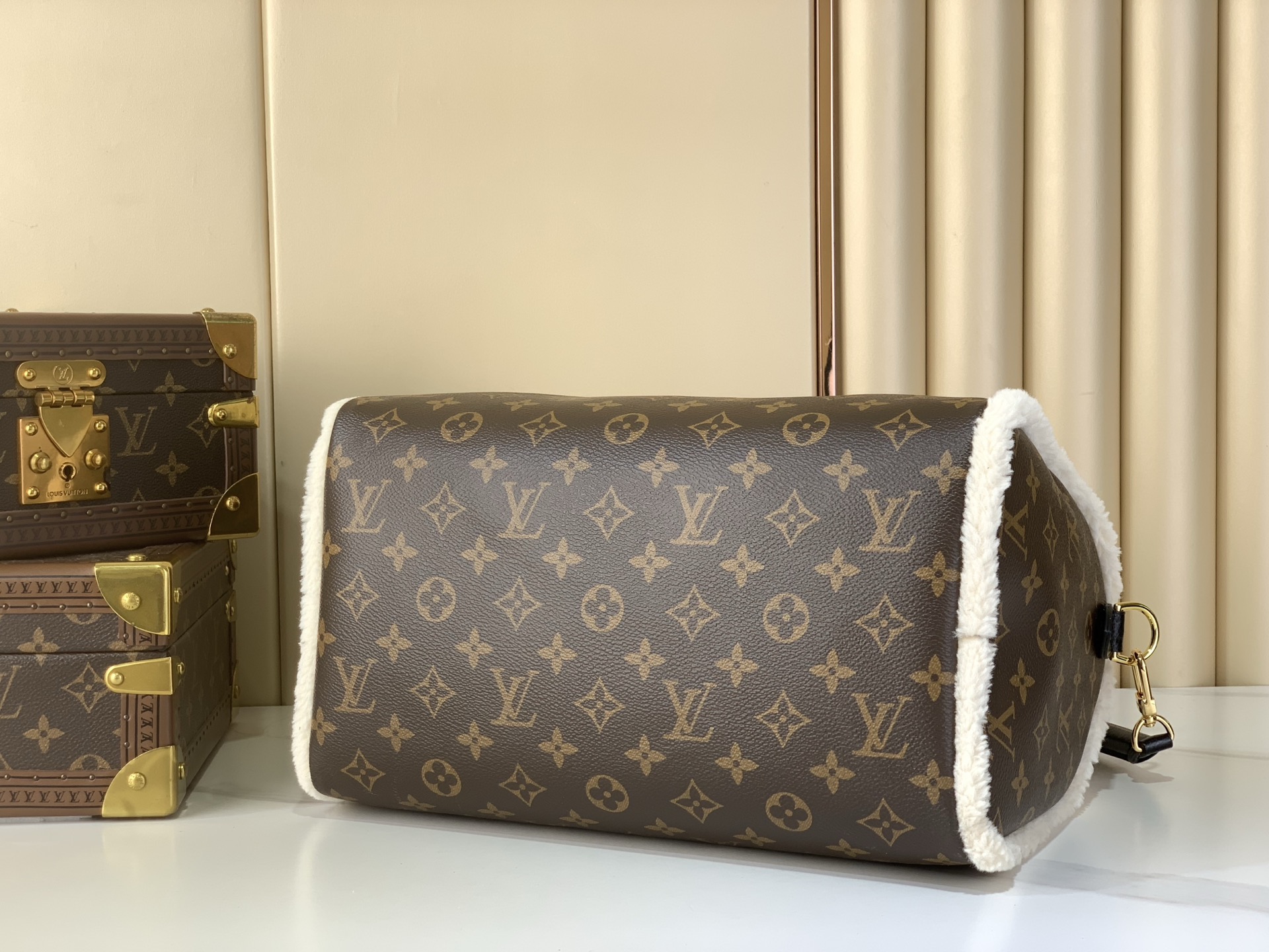 The Speedy Soft 30 Teddy (M26326) blends classic Monogram canvas with plush shearling trim, creating a warm and nostalgic winter aesthetic. The soft, rounded structure enhances the signature silhouette while maintaining the timeless appeal of the Speedy line. A luggage-style name tag highlights s travel heritage, and the rolled Toron top handles add both comfort and refined craftsmanship.