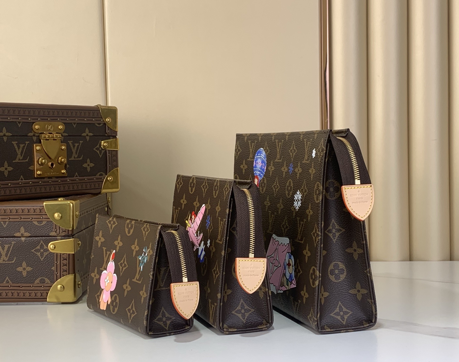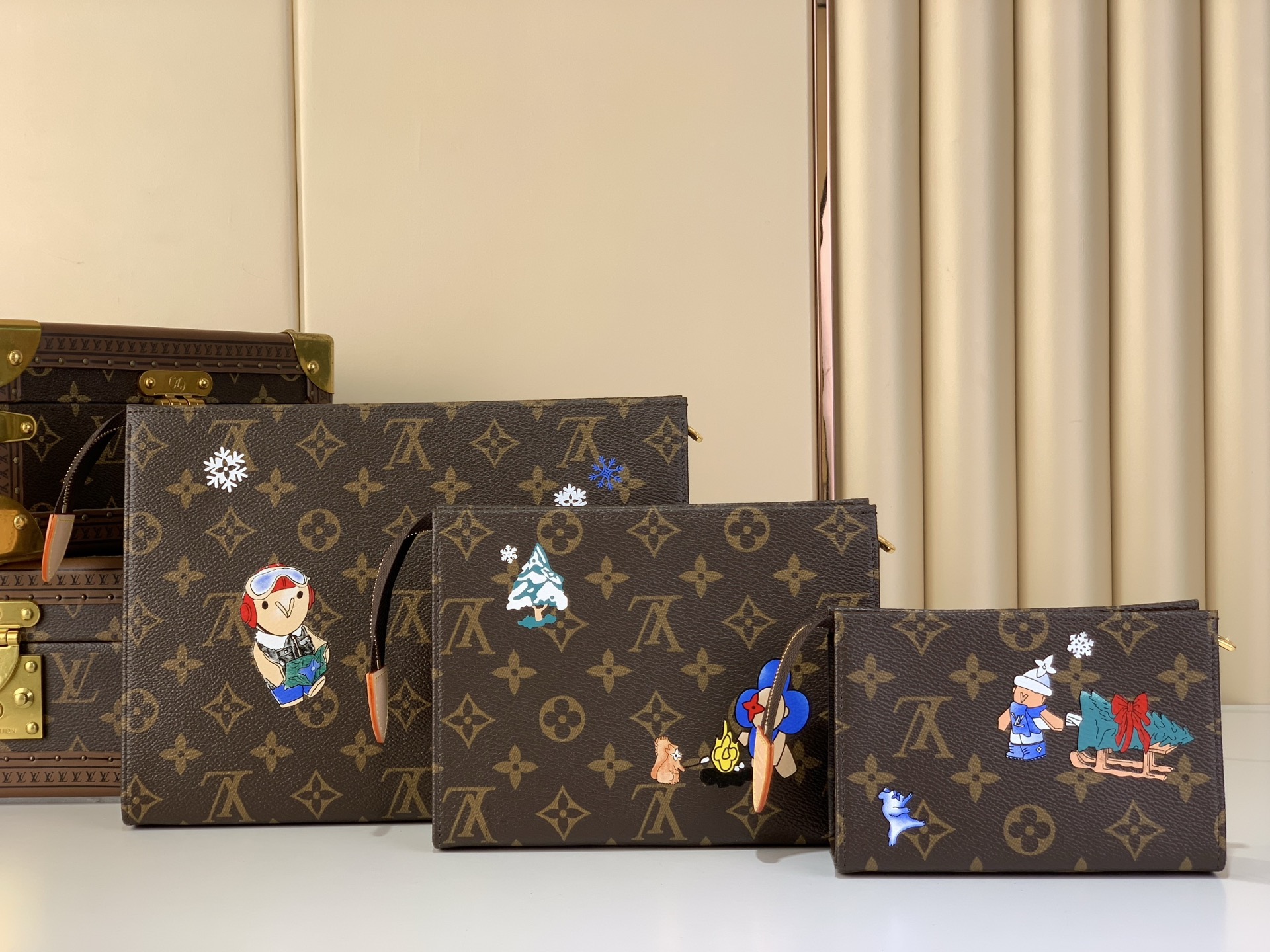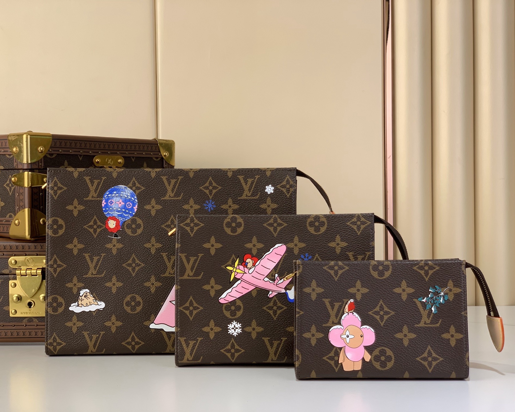 The Trio Toiletry Pouch Christmas Edition (M15357) celebrates the festive spirit of the Vivienne Wintery Travel series with playful winter-themed illustrations on monogram-style coated canvas. Each pouch highlights Vivienne’s whimsical adventures—from riding a train and hiking through snow to soaring in a hot-air balloon—creating a charming and collectible seasonal design.