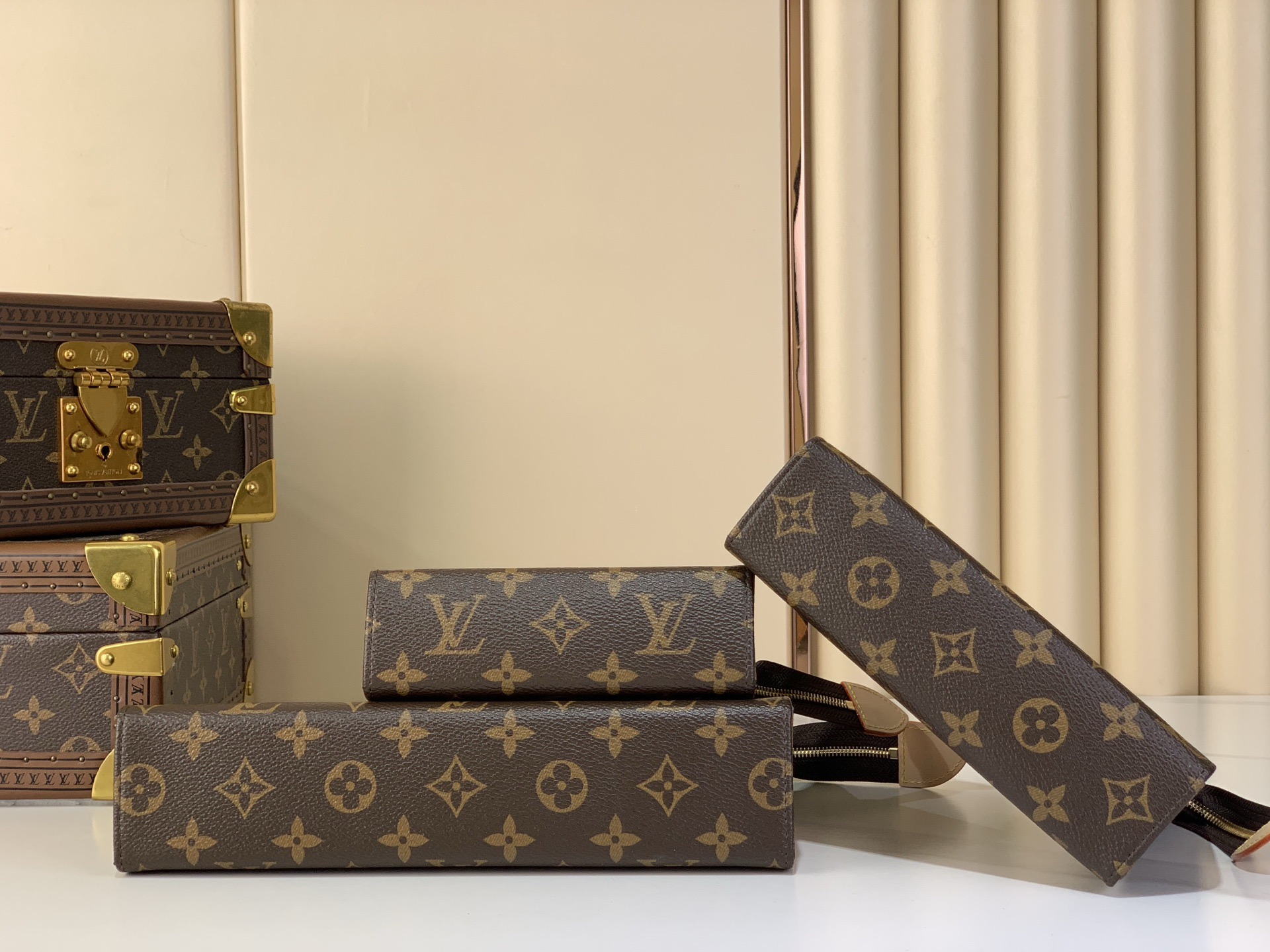 Crafted with durable monogram-style coated canvas and a washable fabric-style lining, the pouch set is practical for organizing beauty essentials, skincare items, or everyday personal accessories. The three-piece structure allows flexible use: carry individually, organize inside larger bags, or use as coordinated travel pouches.